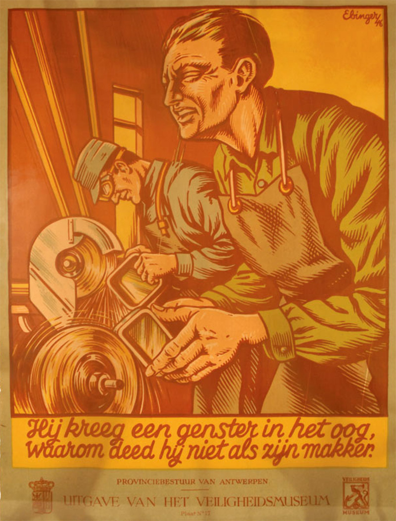 Poster advocating safety goggles while working, illustrated by Gaston Ebinger.