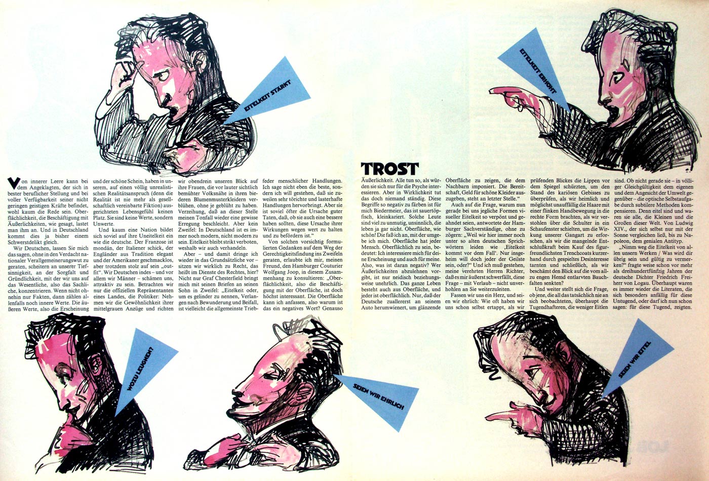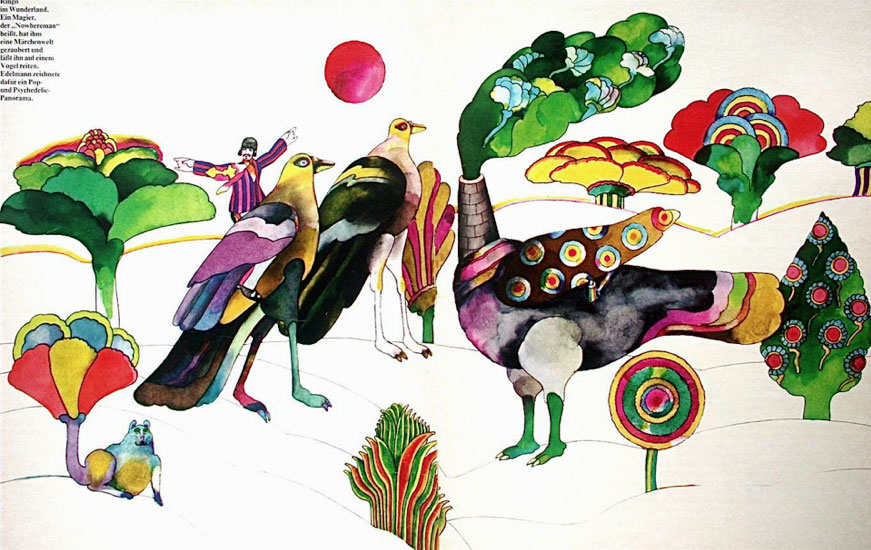 Heinz Edelmann was born in 1934 in Ústi nad Labem, Czechoslovakia, as a child of Czech-German parents. From 1953 on, he studied printmaking at the Kunstakademie of Düsseldorf. After his graduation in 1958, he worked as a freelance illustrator and designer, creating posters for Westdeutscher Rundfunk and Klett-Cola. From 1961 on, he published in the youth magazine Twen and also provided graphics for Playboy, Capital, Pardon and FAZ-Magazin. His colorful, fluid and stylized illustration work was strongly inspired by Art Nouveau and perfectly appealed to the psychedelia craze of the 1960s. In 1966, Edelmann made animated cartoons for the TV series 'Schaumagazin' on the German TV network WDR.