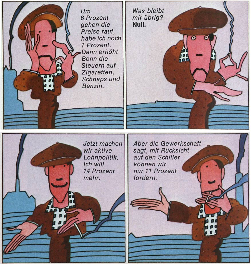 Still, Edelmann didn't abandon animation. He designed the animated opening credits of the weekly late-night movie show 'Der phantastische Film' (1970) on the German public channel ZDF, as well as an animated film set to the song 'The Girl from Ipanema' by Antonio Carlos Jobim and Astrud Gilberto. Edelmann also remained active as a book illustrator for fantasy and SF novels such as 'Andromedar SR1', 'Lord of the Rings' and 'Wind in the Willows'. During the 1980s and early 1990s, he illustrated visual essays and made satirical cartoons and illustrations for the Sunday editions of the Frankfurter Allgemeine Zeitung and other German magazines. He also designed the official mascot of the World's Fair of Seville (1992): 'Curro'.