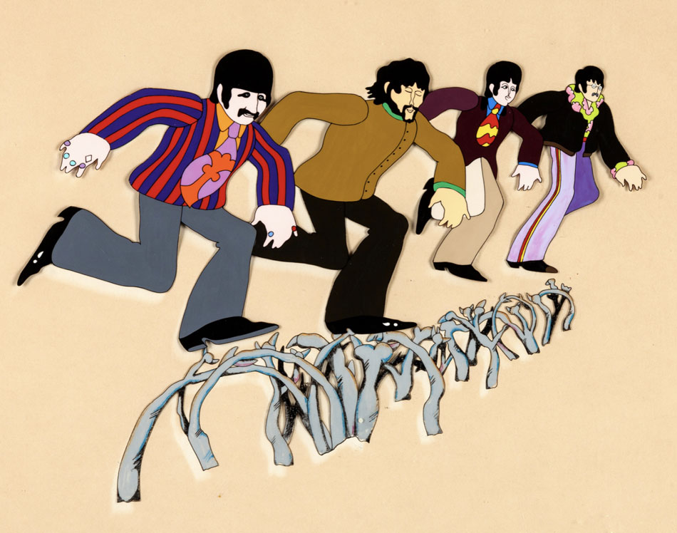 In 1968, Edelmann was approached by British film director George Dunning to work on a new film starring The Beatles. The group had already played themselves in two live-action films, 'A Hard Day's Night' (1964) and 'Help!' (1965), both directed by Richard Lester. While these films were box office hits, their surreal TV movie 'Magical Mystery Tour' (1967) was badly received by critics and audiences. As such, the group wasn't keen on being on a set again for several months. An animated feature would therefore be a perfect solution. Dunning envisioned an animated musical, set to familiar Beatles hits. The film would be named 'Yellow Submarine', after the group's 1966 hit. Dunning hired Jack Mendelsohn, who was scriptwriter on the animated TV series 'The Beatles' (1965-1969), produced by ABC. This TV show featured John, Paul, George and Ringo enjoying child-like slapstick adventures, with Beatles songs as intermezzos. However, the Beatles were voiced by actors, one of them Lance Percival, who did both Paul and Ringo, and would later play the character Old Fred in 'Yellow Submarine'. While the show was the first attempt to feature The Beatles as animated characters, the real-life Beatles hated the program. The animation was very low-budget, the voice actors' impressions unconvincing and their personalities simplified to infantile caricatures. The Fab Four therefore refused to lend their voices to Dunning's project. Even when Walt Disney asked them to voice a group of singing vultures in his animated feature 'The Jungle Book' (1967), the group rejected the offer firmly. Disney solved the matter by having actors imitate their voices, while his songwriter-composer duo The Sherman Brothers composed a Beatlesque barbershop quartet song, 'We Are Friends', for the film.