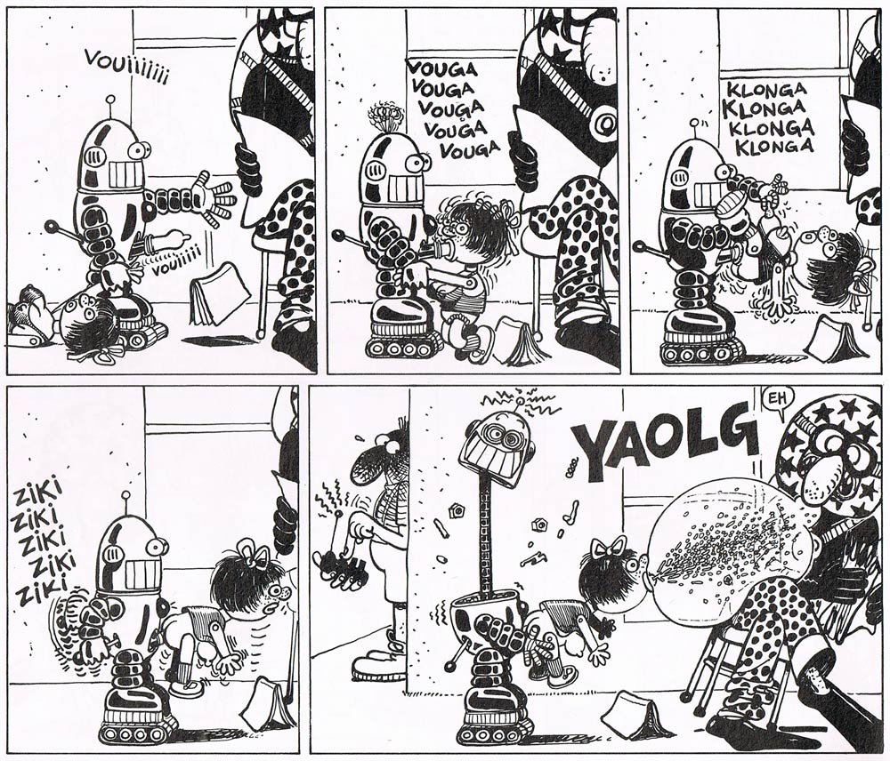 Édika has made some additional appearances in Pilote (1980-1984), and in Psikopat (1982-1984), the magazine edited by brother Paul Carali. One of the true masters of French humor, his work has been collected in over 35 books by Audie/Fluide Glacial since 1981. Among his titles are 'Débiloff Profondikum' (1981), 'Pyjama Blouze' (1989), 'Melon Bago' (1993), 'Pom-Pom-Pidou-Waah' (1996), 'Aïe Woze Djonking' (2003) and 'Mezze Falafel' (2015). His work has also been translated to English, Spanish, Italian, German, Swedish, Danish and Greek.
