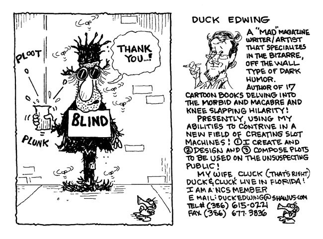 In addition, Duck Edwing invented the "Golden Gator Award", a small sculpture of an alligator, intended for the wives of cartoonists. In 1994, Edwing was also commissioned by the American Red Cross to design billboards warning drivers in case of hurricanes and giving them advice. They were planted all over Florida. In 2003, he began designing slot machines for International Game Technology, the world's largest slot machine developer. He was a member of the American Legion and the National Cartoonist Society.