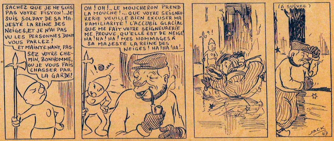When C.B.A. folded shortly after the war, most of Jacques Eggermont's former colleagues moved on to become important comic creators for the publishing house Dupuis. However, Eggermont didn't feel much for this medium. Using the pen name "Jack", he nevertheless made a couple of comics to make some money. Most of them appeared in the Brussels magazine Feu Sacré, the weekly organ of the Eucharistic Crusade and the Federation of Cadets (some sources erroneously say he worked for Franc Jeu, but that magazine had been out of print since August 1945). Between 8 December 1946 and 6 July 1947, Feu Sacré serialized Eggermont's comic 'Les Aventures de Kaatje et Klopje: Le Palais de Glace', followed between 28 September 1947 and 22 February 1948 by 'Le Bateau de Klopje'. In 1947, 'Kaatje et Klopje' was also published in Route Fière magazine.