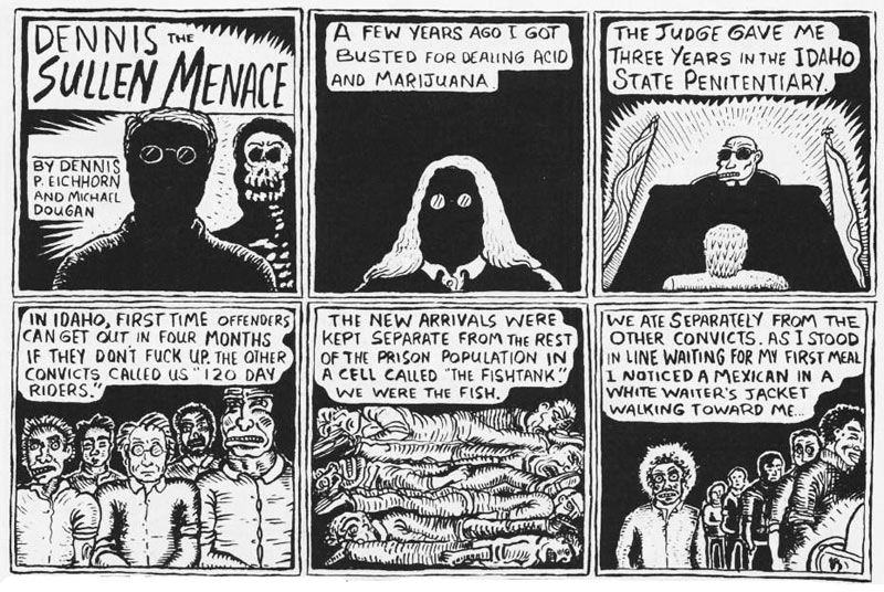Eichhorn did his first professional comix work for Peter Bagge's Weirdo magazine in the early 1980s. His anthology series 'Real Stuff', containing autobiographical stories in the tradition of Harvey Pekar, was published by Fantagraphics from 1990 to 1995. Eichhorn's stories were action-filled tales of sex, substance abuse, and violence, especially the ones published in his other series, 'Real Smut'. Sections of his comic stories for 'Real Stuff' were later collected in the books 'The Legend of Wild Man Fischer' (Top Shelf, 2004) and 'Real Stuff by Dennis P. Eichhorn and a Host of Artists' (Swifty Morales Press, 2004).