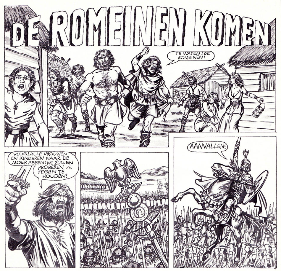 During the 1970s, Van Eijck tried his hand at creating comics himself, mostly on historical subjects. Together with Cor de Boer, he created the short story 'Jean-Claude Satisfait' in Mach magazine (1972). With Frits de Winter as co-writer, he created the full-length comic 'De Opstand der Bataven', visualizing the historic rebellion of the Celtic tribe the Batavi in 69-70 AD against the Romans. The artist modelled the main character Julius Civilis after himself, including the historically correct blind left eye. Even though the story was created in the 1970s, it didn't receive a proper book publication until 1982, when Arboris released it in its 'Arboris Stripselektie' collection. Remarkably enough, Van Eijck wasn't the first Dutchman to create a picture story about the Batavan Uprising: between 1600 and 1613, painter Otto van Veen also made a series of 12 sequential paintings about this event.