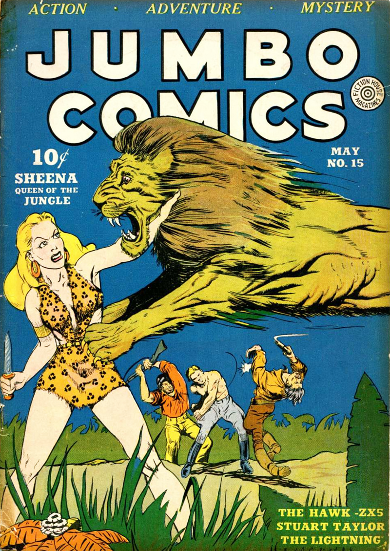 Through syndication by Editors Press Service, 'Sheena, Queen of the Jungle' debuted in the first issue of Wags, a British tabloid magazine (January 1937) before appearing in the U.S. in Jumbo Comics (issue #1, September 1938), published by Fiction House. It took until the spring of 1942 before she received her own title, 'Sheena, Queen of the Jungle', making her the first U.S. female comic character with her own comic book series. 'Sheena' became a tremendous best-seller and the series continued until April 1953. Many readers were more interested in the idea of a sexy blonde in a fur bikini strolling around in the wild than the plotlines. Despite never showing anything risqué, the comic book had an erotic flavor. Most other mainstream comics of the 1930s, other than Norman Pett's 'Jane' in Britain, weren't so sexually suggestive. Sheena was also strong, intelligent and independent, and far less passive than most female comic characters. As most 'Sheena' stories featured her rescuing men, the comic also appealed to and attracted a large female readership. 'Sheena, Queen of the Jungle' was the first "jungle princess" character in comics and inspired many similar comics, including 'Camilla, Jungle Queen' (Charles A. Winter, 1940), 'Tiger Girl' (Robert Webb, 1944), 'Princess Pantha' (Art Saaf, 1946), 'Tegra, Jungle Empress', and/or 'Tygra of the Flame People' (1948) , 'Rulah, Jungle Goddess' (Matt Baker, 1947), 'Rarotonga' (Guillermo de la Parra, Constantino Rábago, Antonio Gutiérrez, 1951-1998), 'Lorna the Jungle Girl' (Don Rico, Werner Roth, 1953), 'Jann of the Jungle' (Don Rico, Jay Scott Pike, 1954), 'Leopard Girl' (Don Rico, Al Hartley, 1954), 'Shanna the She-Devil' (Carole Seuling and George Tuska, 1972) and 'Rima the Jungle Girl' (Robert Kanigher, Nestor Redondo and Joe Kubert, 1974-1975).