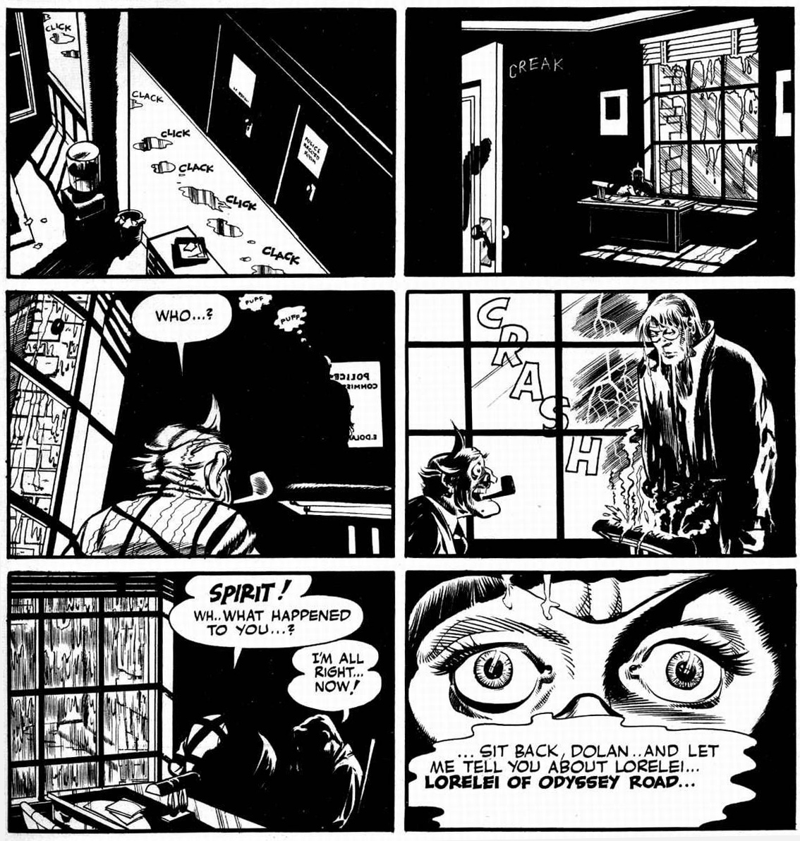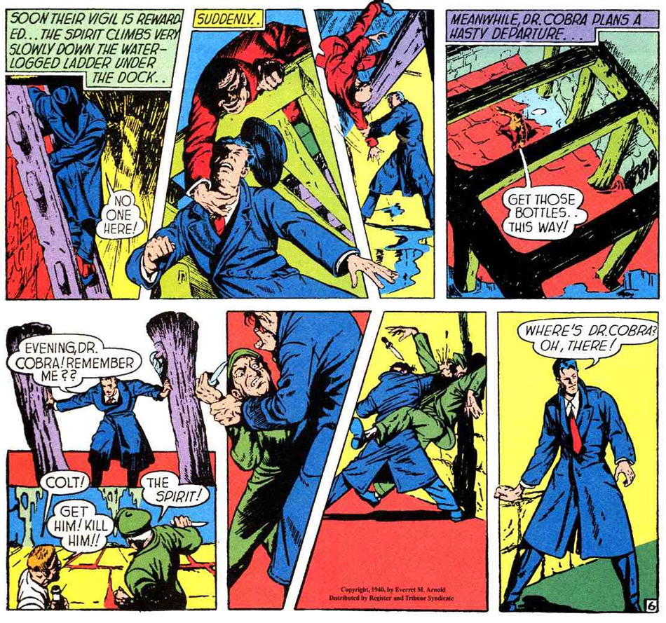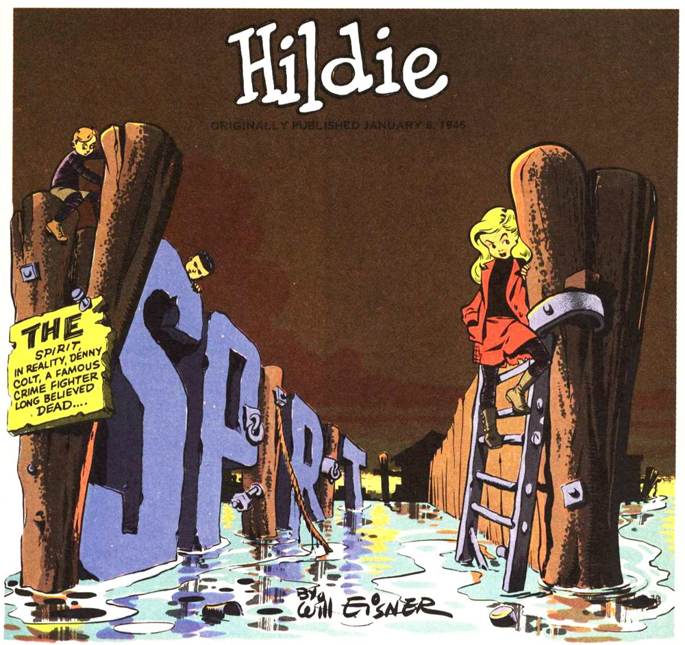 Opening panel for The Spirit Section of 6 January 1946 (recolored version for the reprint by Kitchen Sink Press in The Spirit #1 (1983).