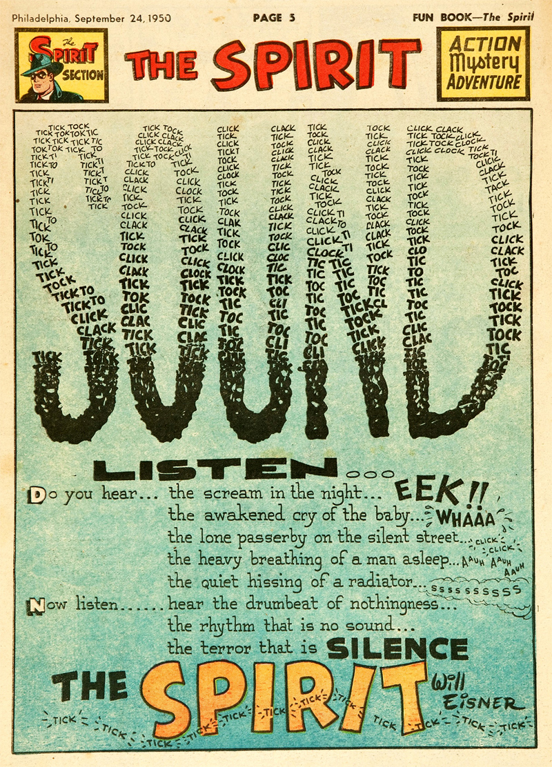 Since Eisner had more pages to work with, he had more ability to build up his story and create atmosphere. In many stories, he uses innovative perspectives, shadow work, framing angles and colors to enhance a gritty atmosphere. 'The Spirit' makes frequent use of mist, starry skies, steaming sewers and especially rainstorms with water gushing down sidewalks. In the homage book 'Spirit Jam' (1981), Harvey Kurtzman dubbed these typical rainy scenes "Eisenspritz". On the surface, 'The Spirit' is a typical 1940s detective noir comic, but upon close examination, it reveals deeper levels. Eisner, for instance, enjoyed playing with the visual look and narration. A typical episode begins with a splash panel to grab readers' attention. Yet these weren't always huge drawings. On 13 October 1940, for instance, the first page looks like a newspaper article. The episode of 1 June 1941 narrates all action in rhyme. On 22 June 1941, Eisner wrote everything in the style of a fairy tale, with the sentences filling the pages and tiny cartoons appearing in between certain words. He used a cutaway of various rooms in a house in 'The School for Girls' (19 January 1947), making the walls look like a comic strip page. In 'Ebony's X-Ray Eyes' (15 September 1940), The Spirit's assistant Ebony sees all action as if it was an X-Ray, drawn in a black-and-white chalkboard style.