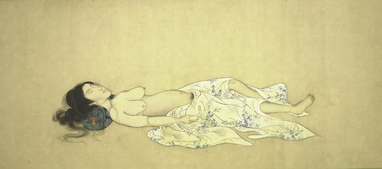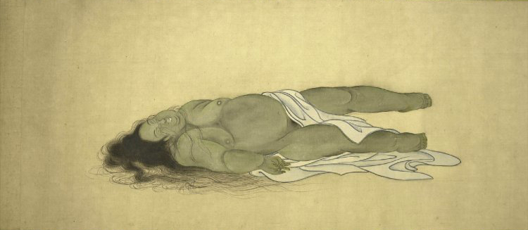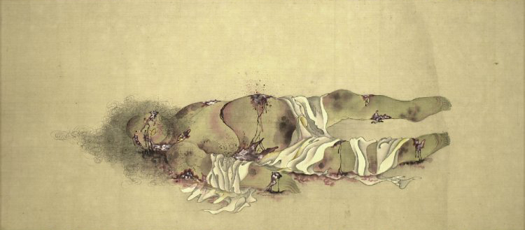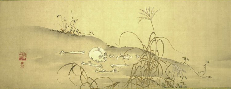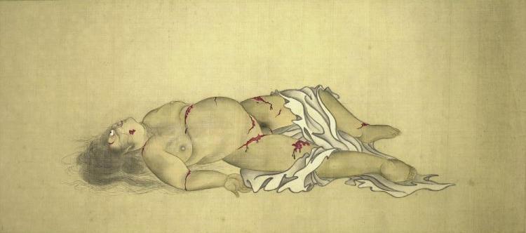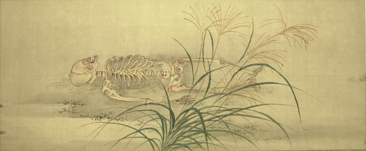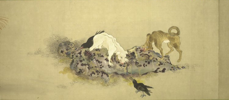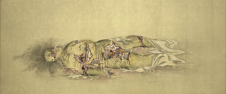 In the 1870s, Eitaku made a scroll showing the decomposition of a female corpse, identified as a courtesan. In nine successive scenes, we see a fully clothed body devolve into bony remains, scavenged by dogs. The work is quite graphic for its time and even today has the power to shock audiences, as the gradual decomposition is not stylized, but depicted realistically. This would give the eerie impression that Eitaku may have sketched and painted an actual corpse. The work should be understood in a Buddhist context. "Kusozu" (illustrations of decomposing corpses) were popular in Japanse art, because they were considered a meditation on the temporary nature of life. It might also an erotic work, part of the "shunga tradition". In 2008, the work was purchased by the British Museum.