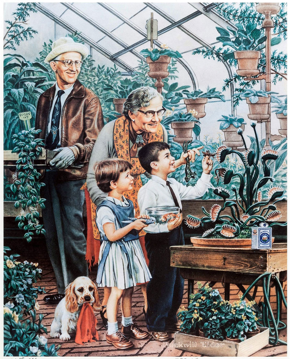 Unfortunately, Trump far exceeded its budget, right when Playboy's major distributor, American News, faced bankruptcy. Hefner was forced to make some financial cuts to survive, including discontinuing Trump after only two issues. Elder had prepared an illustration for the never-released next issue, depicting an elderly couple feeding frogs and birds to carnivorous plants, all drawn in the gentle style of Norman Rockwell.