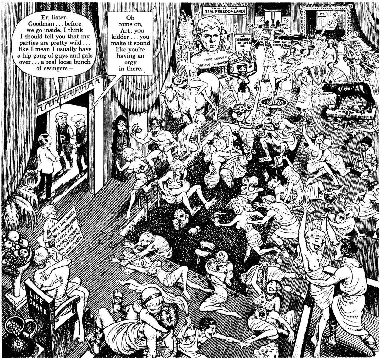 In August 1960, Harvey Kurtzman launched yet another satirical magazine, Help!, relying more on photo collage spoofs and fumetti (photo comics) than actual hand-drawn comics. The most notable exception was Kurtzman and Elder's 'Goodman Beaver' feature, which debuted in issue #10 (May 1961). Goodman was a character who originated in Kurtzman's previous graphic novel Jungle Book, but was now recast as a young idealist typically finding himself in an odd location, asking questions about the madness surrounding him. In one episode he goes to Africa, where he confronts Tarzan with his supposed white colonial attitudes towards the natives. In 'Goodman, Underwater' (May 1962), Goodman meets a Don Quixotesque underwater crimefighter who fights invisible enemies. The entire story is done in the style of Gustave Doré's illustrations of Cervantes' famous novel. Other episodes brought Goodman in contact with Marlon Brando and a disillusioned Superman. In 'Goodman Goes Playboy' (issue #13, February 1962), the teenager meets Archie from Archie Comics who has now succumbed to the Playboy style. Archie and his friends turn out to have signed a pact with "the Devil", AKA Hugh Hefner. As many follow their example, Goodman wonders whether he "should leave to find a place where the dark forces aren't closing in... where honor is still sacred and where virtue triumphs?" But he quickly changes his mind: "Maybe I should sign up."