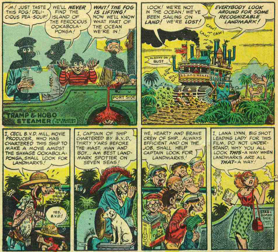 Harvey Kurtzman discovered that Elder was a good stylistic parodist. He could recreate the look of well-known comic series so precisely that he was soon asked to make spoofs in this field instead, namely DC Comics' 'Wonder Woman' (issue #10, April 1954), Bob Montana's 'Archie' (issue #12, June 1954), Lee Falk & Phil Davis' 'Mandrake the Magician' (issue #14, August 1954), Frank King's 'Gasoline Alley' (issue #15, September 1954), George McManus' 'Bringing Up Father' (issue #17, November 1954, with part of the story illustrated by Bernard Krigstein), Disney comics (issue #19, January 1955), Rudolph Dirks' Katzenjammer Kids' (issue #20, February 1955) and E.C. Segar's 'Popeye' ((issue #21, March 1955). Even EC Comics' own horror comics were lampooned in 'Outer Sanctum!' (issue #5, June 1953).