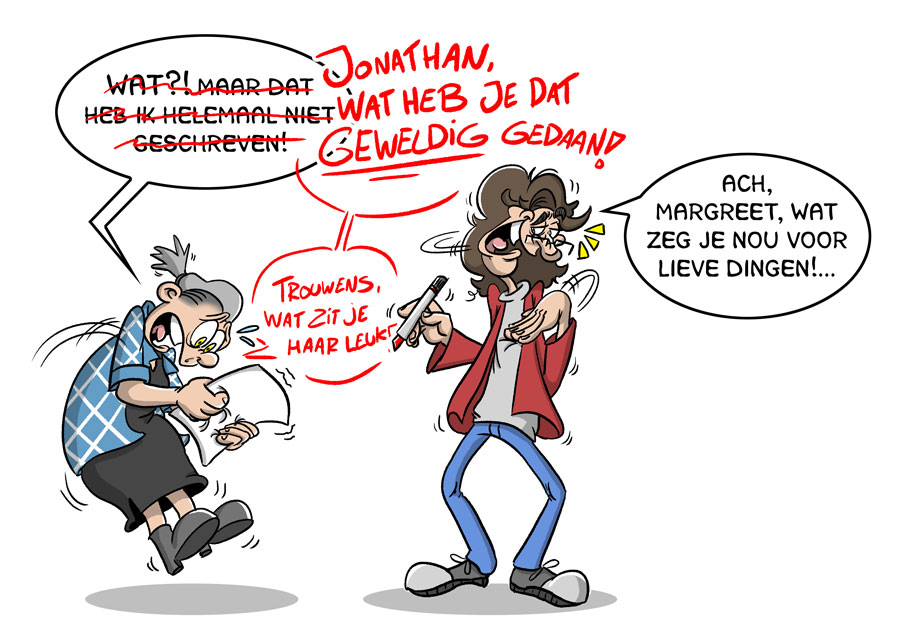 Segment of the 'Hersenspinsels' comic in Stripglossy, in which Jonathan van Engelenhoven talks about working with his editor Bas Schuddeboom on his Disney scripts (2022).