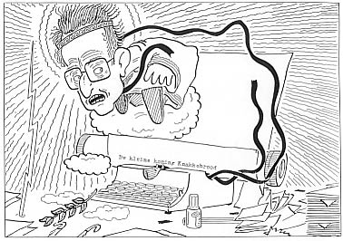 Sports, and especially marathons, are also a recurring theme in Faes' work. The marathon was the subject in his illustrated novel 'Over De Streep'. His comic 'De Ware Geschiedenis van Leonidas van Phaesia' dealt with the history of the Olympic Games in Antiquity. His comic strip 'Fabel-achtig' was made by commission of assurance company Fortis and handed out to the runners of the marathon of Rotterdam in 2000. Other comics by Faes are 'De Leeuw Is Los!', a comic book by commission of insurance company AMEV, and 'Beertje Bombazijn', a biting balloon comic about infamous Dutch author Willem Frederik Hermans and his work.