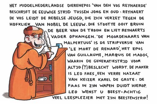 When Faes noticed his students had difficulties understanding medieval literature, he translated several of them into the comics format. He has made comics based on Middle Dutch miracle plays, poems and stories like 'Mariken van Nieumeghen' ('Die Duivelse Marieke!', 1992), 'Karel ende Elegast' ('Keizer Karel en Elegast', 1998) and 'Van den Vos Reynaerde' ('Reynaerts wraak', 1998). The latter was first serialized in the scientific magazine Tiecelijn between 1996 and 1998. His scientific study 'Elegast is Malegijs - Ingelheim is Tongeren' (2009, with classic illustrations by Bernard Reith) and his literary thriller 'Dood De Vier Heemskinderen!' (2010) also referred to the Middle Dutch epic poem 'Karel ende Elegast', as well as the Old French-Flemish medieval tale 'The Four Sons of Aymon'. In 2017, Faes brought out another comic book based on Reynaert the Fox: 'De Moordenaars van Malpertuus' (Peter Bonte, Brugge, 2017).