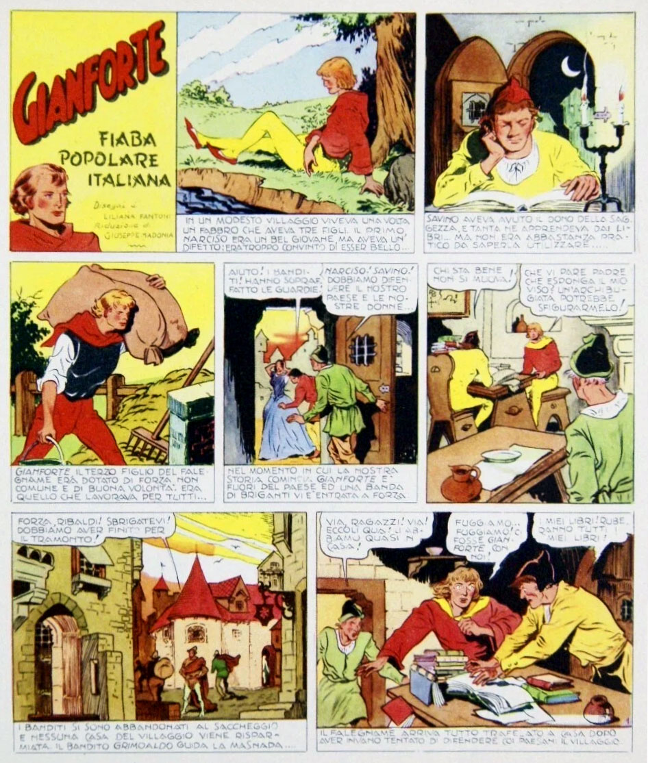 Liliana Fantoni was born in Florence in 1920. Like her younger brother Mario, she followed in the footsteps of her father, Guido Fantoni, and pursued a career in arts. During the 1930s, she debuted as an artist in the pages of Modellina, the children's supplement of the women's magazine Modella, published by the Neapolitan newspaper Il Mattino. A few years later, she appeared in the pages of the Napolese comics paper Giornale dei Ragazzi with the adventure serials 'Le Avventure di Straccetto' and 'La Banda dagli Speroni d'Argento' (1944-1946).