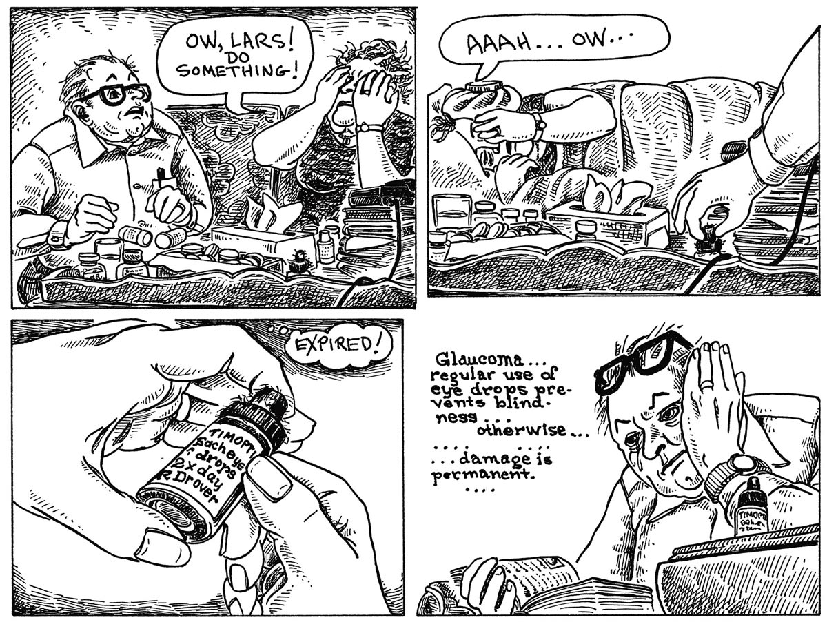 Joyce Farmer also contributed to issues 5 through 11 of the other all-woman comix publication, Wimmen's Comix, between 1975 and 1987. Unable to earn a living in the scene, accompanied by periods in a turbulent marriage and as a single mother, Farmer disappeared off the comics radar and went to work as a bail-bond agent in the 1980s. When her aging father and stepmother became ill, she dedicated all her free time to their care in the late 1980s and early 1990s. She started chronicling their final years and slow decline in comics format after remarrying and moving to Laguna Beach.
