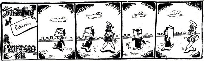 Between 1938 and 1942, Fellini contributed cartoons and comics to Marc'Aurelio and two other magazines, 420 and Domenica del Corriere. Among his features were the gag comics 'Giacomino', 'Cico e Pallina' and 'Geppi, La Bimba Atomica'. The characters of Cico and Pallina also appeared in the radio show 'Terziglio' (1942), broadcast on EIAR. The scripts for the show were written by Fellini, while the voice of Pallina was performed by actress Giulietta Masina, who later became his wife. 'Geppi, La Bimba Atomica' was a gag comic about a naughty pig-tailed girl. Around this time, Fellini also drew a four-panel pantomime gag comic titled 'Storieline di Il Professore', about a professor with a love for attractive women.