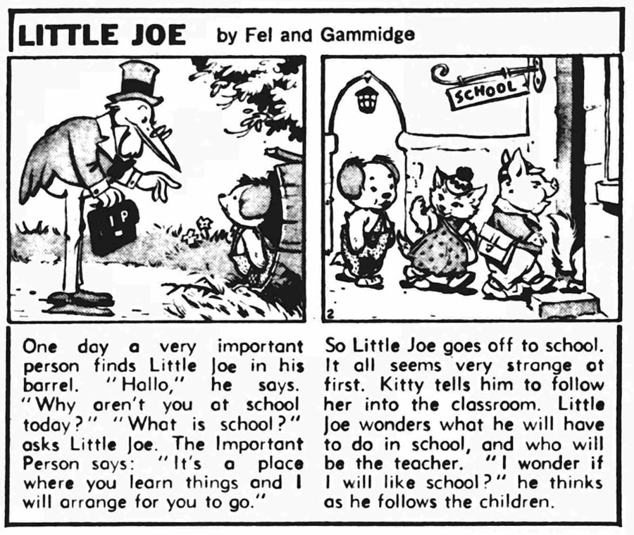 In the early 1970s he collaborated with Ian Gammidge on 'Little Joe', a newspaper comic about a little puppy which appeared in London's The Daily Mirror from 15 April 1973 until 30 November 1976. A book version was published by Mirror Group Books in 1975. Between 1 December 1973 and 4 April 1977, this strip also ran in the Dutch newspaper De Telegraaf, under the title 'Kleine Pom'. Felstead also illustrated the books 'My Favourite Nursery Rhymes' (1977) and 'Time for Play' (1977).