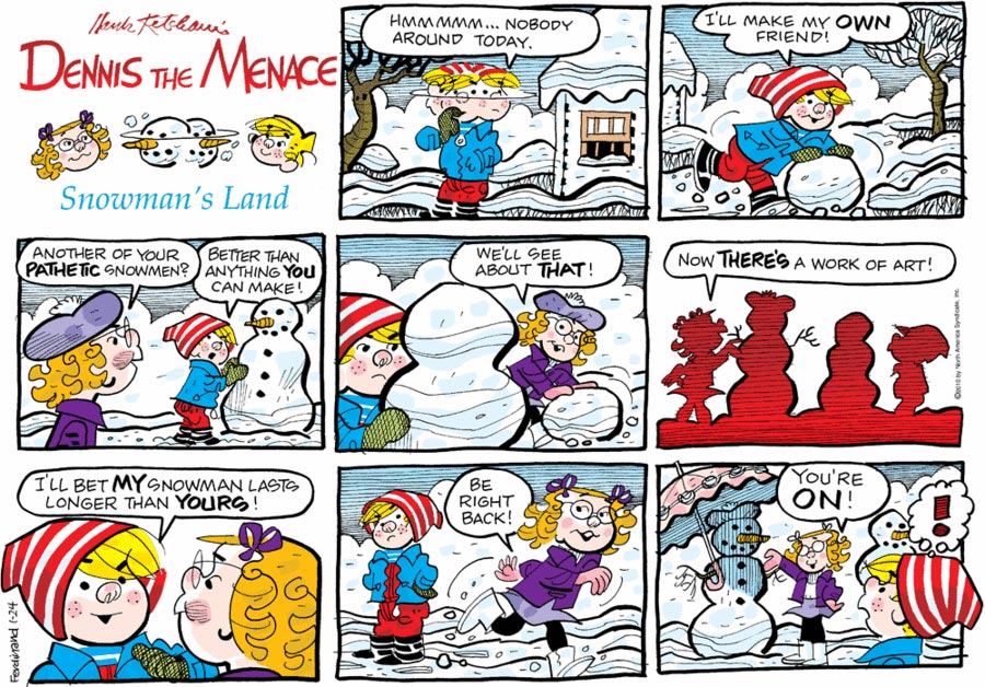 After a few months of correspondence, during which Ketcham sent him some gags to rough out and ink, Ferdinand was hired. Relocating to Ketcham's California house studio in September 1981, Ferdinand was initially tasked with drawing stories for the 'Dennis the Menace' comic book by Marvel Comics (1981-1982), along with Karen Matchette and Brian Lum. When Bob Bugg, who did the 'Dennis' Sunday comics, quit, Ferdinand and Matchette were assigned with creating this weekly color comic for the newspapers. Ferdinand eventually became solely responsible for drawing this Sunday feature. Ketcham kept supervision, but devoted most of his time to the daily panel, until he passed it on to Marcus Hamilton in 1994. Based in Pine Bush, New York, Ron Ferdinand has continued to produce the 'Dennis the Menace' Sunday comic after Ketcham's death in 2001. Both he and dailies artist Hamilton weren't credited until January 2003. Since 2010, both artists work under supervision of the creator's son Scott Ketcham, who is actively involved in the writing, editing and inking too.