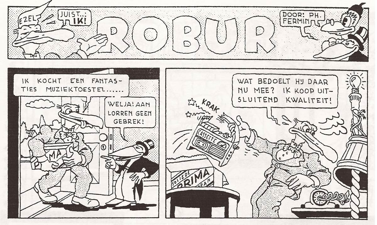 Flip Fermin may not be a household name within the realm of Dutch underground comix, but he was nevertheless an enigmatic personality within the Amsterdam comic scene of the 1970s and 1980s. A promising artist, his talents unfortunately never came to bloom. During his lifetime, he only published a couple of stories, which mostly starred the anthropomorphic birds 'Robur & Pennekamp'. While he is usually referred to as Flip Fermin, he often signed his work with "Ph. Fermin". In addition, he used the pen names Kadierung Heinz, Framing Hank, Dr. Friedrich Axel and Phileas Spleeno.