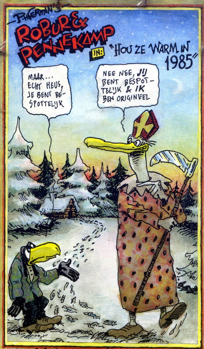 Flip Fermin's own body of work has remained limited to only a handful of finished comic stories. Most of his plans and projects stranded after only a couple of pages or episodes, largely because of the artist's ever-changing interests and perfectionism. Recurring characters in his artwork were anthropomorphic birds, including his signature characters Robur and Pennekamp, and an artistocrat with top hat and eyeglass, known simply as "The Baron". Although Fermin was obviously influenced by the underground comix movement, the few comic stories he created saw print in children's magazines. Among them were two pages starring the anthropomorphic birds 'Robur & Pennekamp' for Mickey Maandblad (issue #7 in 1977) and a story with the same characters in the seasonal book 'Winterboek Okki/Jippo 1976-1977'. In 1977, Fermin took over the artwork of Joost Swarte's dog and clown characters 'Katoen+Pinbal' in Jippo magazine. Scripted by Swarte, serialization of Fermin's episode 'Huize "Bel-Air"' started in issue #21 of that year. But many times, Fermin's perfectionism kept him from making his deadlines, and after 23 pages, the serialization was aborted. After that, Joost Swarte resumed the feature on his own.