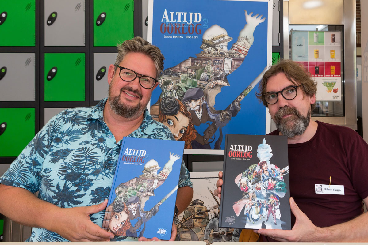 Together with comic artist Jimmy Hostens, Feys created the two-parter 'Altijd Ergens Oorlog' (Bibliodroom, 2016-2018), a graphic novel set in Roeselare, West Flanders, during the First World War. The book follows the diary of a young girl, Marie, who lives through the German occupation. The real-life nurse and spy Martha Cnockaert also has an important role in the story. Feys and Hostens visited the city archives, several museums, read dozens of books and rummaged through several old photographs and pictures to document themselves about the time period. They were particularly inspired by Johan Delbecke's children's novel 'Kinderen In De Eerste Wereldoorlog' and the real-life diary of Jules Dujardin, a 14-year old boy who lived through the First World War. The first volume of Altijd Ergens Oorlog' was released in November 2016, the second in October 2018. Both books were a critical and commercial success. Within only a couple of years they already received three reprints.