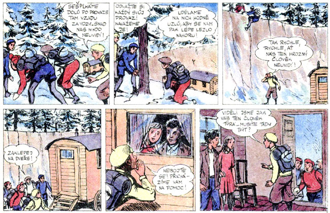 However, the communist government banned the speech balloons from the comic (considered "too western") before eventually banning the series altogether. 'Rychle sipy' didn't return until the late 1960's, at first in reprints and then in new stories drawn by Marko Cermak, since Jan Fischer had passed away in his birth town Prague in January 1960.