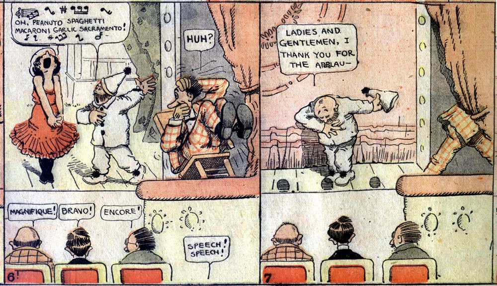 Harry Conway Fisher, who drew the world-famous 'Mutt and Jeff' strip as "Bud" Fisher, was born in Chicago. In 1905, he left the University of Chicago in his third year to take a job as a triple-treat cartoonist (theater, sports and general news) at the San Francisco Chronicle. He persuaded the sports editor to let him draw a page-wide daily comic strip, in imitation of Clare Briggs' 'A. Piker Clerk', called 'A. Mutt', dealing with a chronic horseplayer's wins and losses. In June 1908, 'Mutt and Jeff' moved to William Randolph Hearst's San Francisco Examiner, where it was syndicated by King Features and became a national hit. A Sunday page was added around the time the strip got its permanent title, 'Mutt and Jeff'.