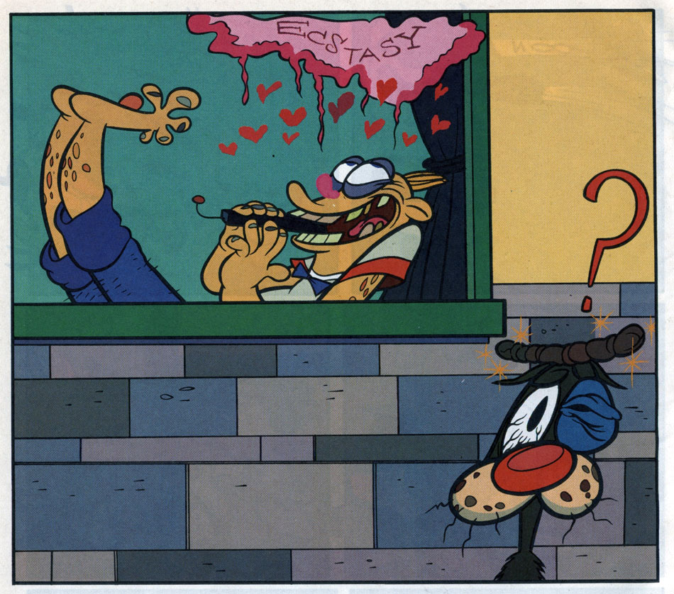 'George Liquor in The Butcher Shop' (Spumco Comic Book). Note the phallic sausages in front of the butcher...