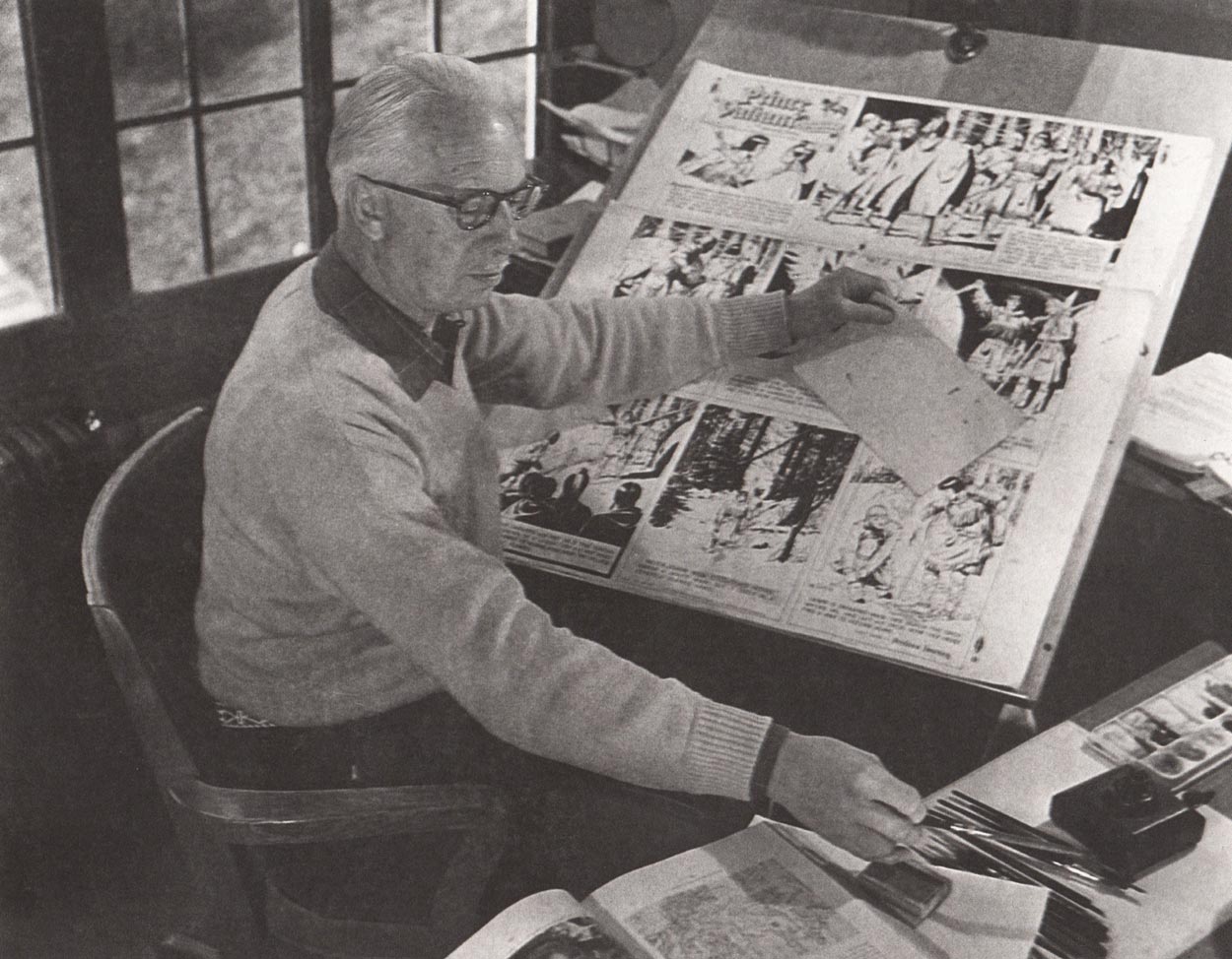 Hal Foster was one of the major artists of American newspaper comics, and one of the medium's great innovators. He was the first to adapt Edgar Rice Burroughs' 'Tarzan of the Apes' into comic format (1929, 1931-1937), but is best known for his Arthurian saga 'Prince Valiant' (1937- ), to which he devoted over forty years of his life. Coming from a background in classical illustration, Foster introduced new techniques into the art of newspaper comics, such as chiaroscuro, naturalistic drawing and use of thorough documentation. His hybrid of fine arts and sequential narrative contained no speech balloons, only short captions, allowing the artist to entertain lavishly with highly detailed backgrounds, mass scenes and atmospheric coloring. His magnificent lay-outs and spell-binding narratives have been imitated, even outright plagiarized, by countless comic artists worldwide. Together with his contemporaries Alex Raymond and Milton Caniff, he ranks as one of the most influential comic artists of all time, earning him the nickname the "Father of the Adventure Strip".