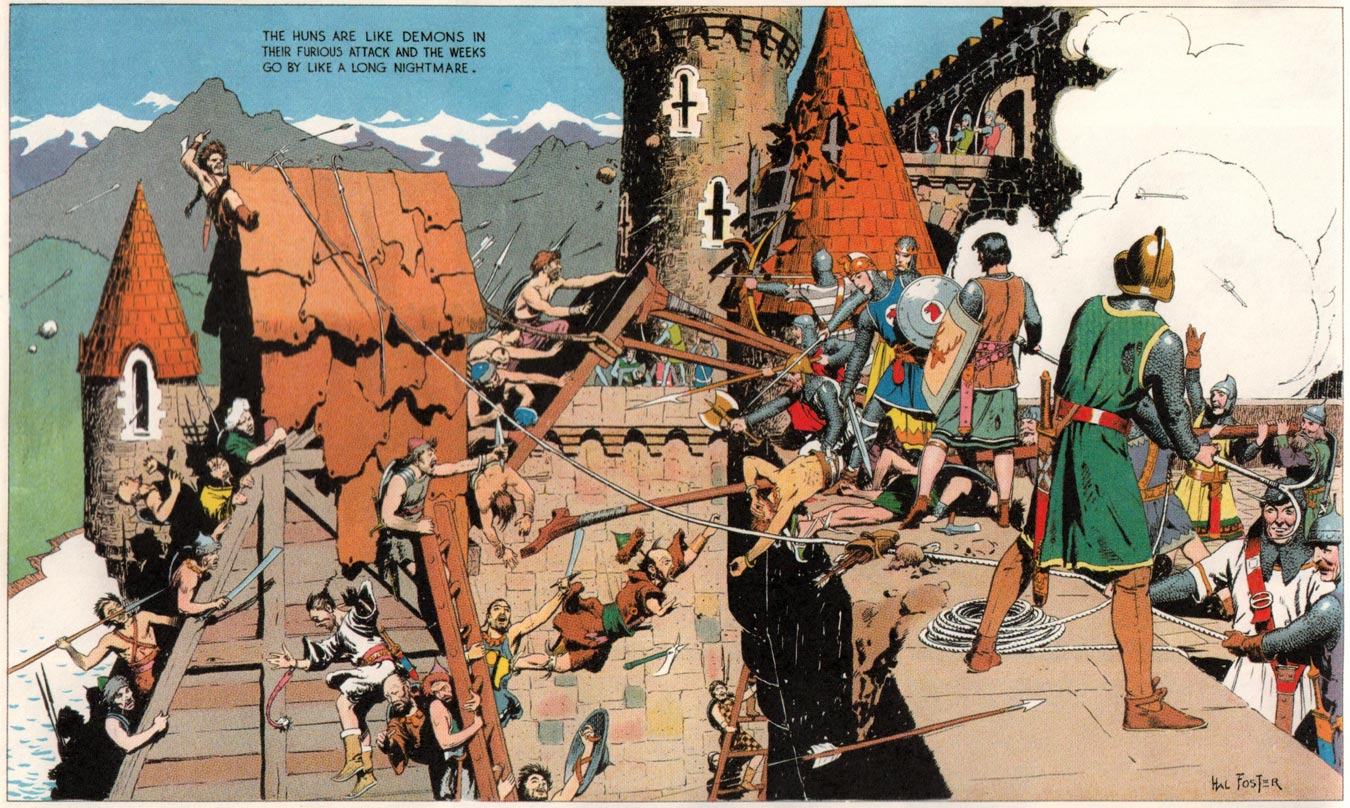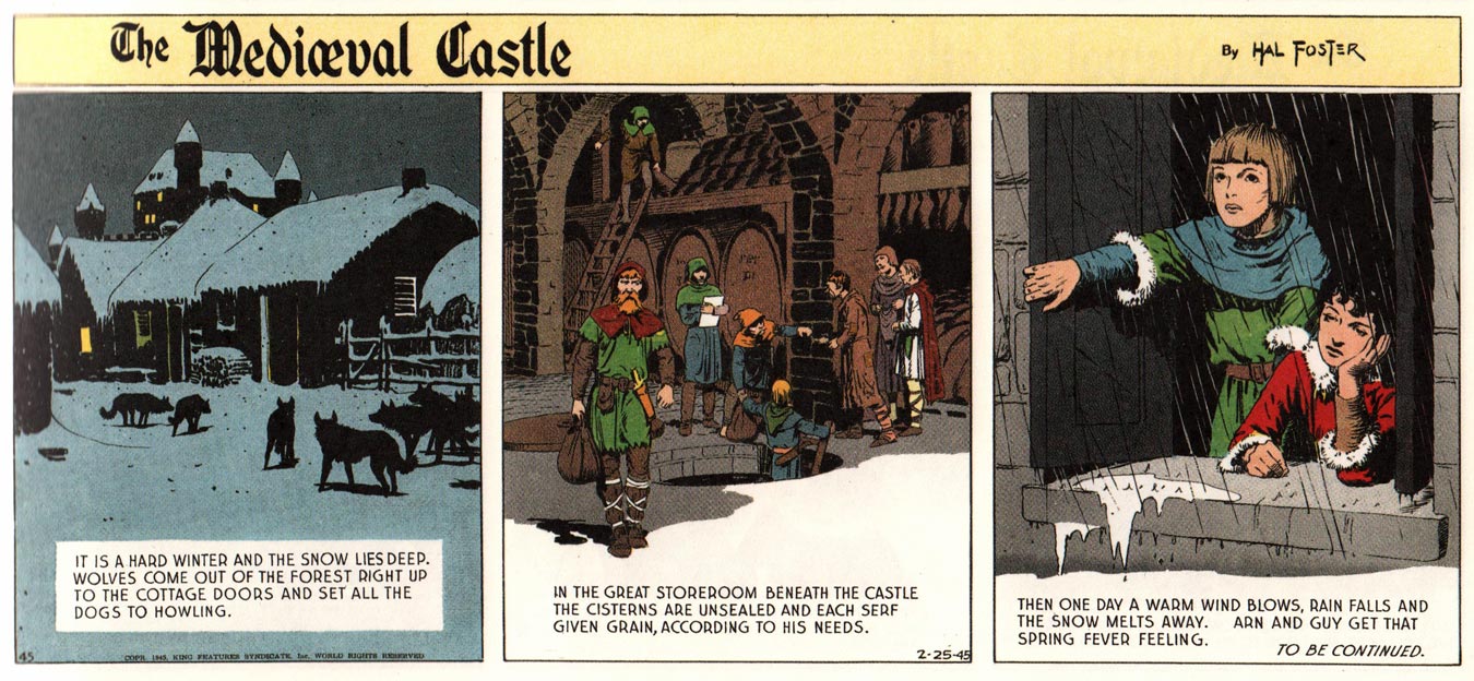 Hal Foster went to great lengths to give his artwork the required quality, spending about 53 hours each week to craft one page. He however worked several weeks ahead, allowing him to work on a couple of other projects too. For King Features' 'Book-of-the-Month' feature, he made a 1943 comic strip adaptation of Frank Werfel's novel 'Song of Bernadette'. World War II paper rationing caused a shrinking of Foster's full page space, but Hearst allowed him to add an independent companion strip that the papers could cut out when they didn't have enough space. Appearing as a so-called footer feature, from 23 April 1944 until 18 November 1945, was 'The Mediaeval Castle'. It was set in the 11th century, while Valiant's adventures were situated in the late 5th/early 6th century. The main heroes were two young English squires in the days of the First Crusade, named Arn and Guy. In December 1948, Foster also provided six drawings detailing the birth of Jesus Christ in King Features' seasonal 'The Christmas Story'.