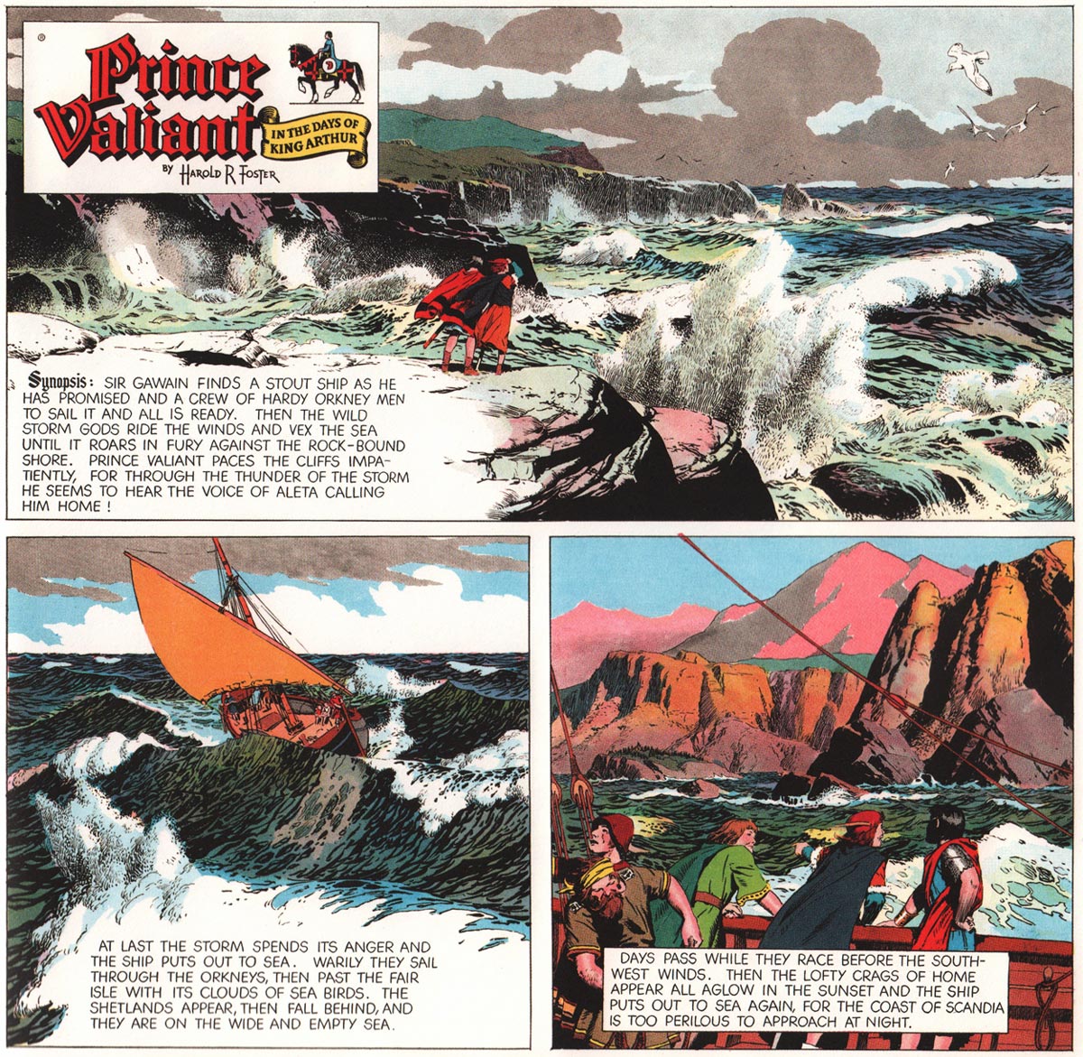 On 13 February 1937, 'Prince Valiant' premiered as a color comic in the Saturday tabloid pages. Sixteen weeks later, it became a full-page Sunday feature, until in 1971, it switched to a half-page format. The large publication format allowed Foster to use different page lay-outs, and produce highly detailed and exquisite pieces of art, especially in his epic fighting scenes and depictions of outdoor life. Just like 'Tarzan', 'Prince Valiant' was made as a text comic, with descriptions and dialogues appearing as captions near the panel corners, leaving the rest of the images free from speech balloons. Much of the page's aesthetics and depth came from the interaction between Foster's use of black ink and the nuanced effects of the four-color printing technique, which the artist used cleverly for creating perspective, texture and atmosphere.