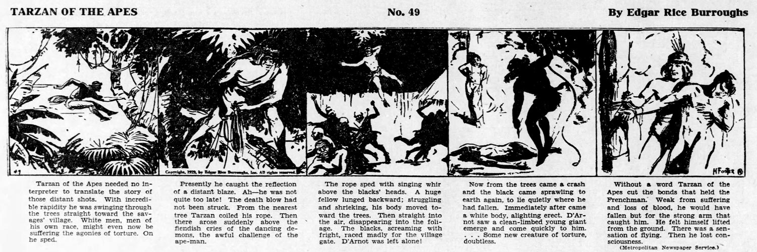 The first 'Tarzan' comic strip by Neebe and Foster was a direct adaptation of the original 1912 Burroughs 1912 novel, 'Tarzan of the Apes'. Oddly enough, the comic didn't debut in U.S. newspapers, but instead made its first print appearance in the British weekly Tit-Bits, in November 1928. From 7 January 1929 on, Canadian and U.S. newspapers also began running the 'Tarzan' comic. In the early days, there were little differences between Burroughs' and Foster's Tarzan. The only novelty introduced in the comics was Tarzan's nobility. Foster made the character the lost son of a British aristocrat. The 'Tarzan' comics were presented in the text comic format, with descriptive texts underneath or next to the images. Speech balloons were totally absent. When the first storyline ended on 27 May 1929, Foster passed the pencil to Rex Maxon, since at the time, Foster wasn’t enamored of the comic medium. However, Burroughs preferred Foster's rendition over Maxon's. By 1931, Foster agreed to return, but only on the condition that he could focus on the weekly Sunday pages, while Maxon continued the dailies.