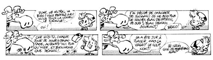 'Vincent Murat' was created in the magazine's traditional round-nosed humor style, which the artist quickly abandoned. By the early 1980s, Frank was already the regular illustrator of Spirou's nature section with his hero 'Broussaille', and the author of the editorial gag strip 'L'Élan' (1981-1987). The latter presented the conversations between Spirou's titular character and a depressed moose with the ambition to become a true comic hero. Éditions Dupuis collected the strip in a single booklet in 1984. A collector's edition was released by the Geneva Comics Association in 1992.
