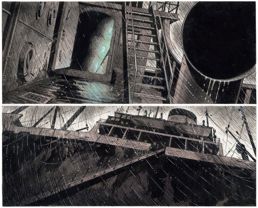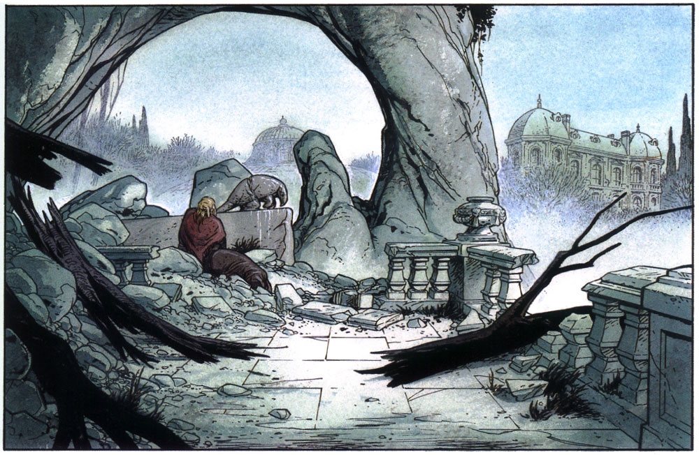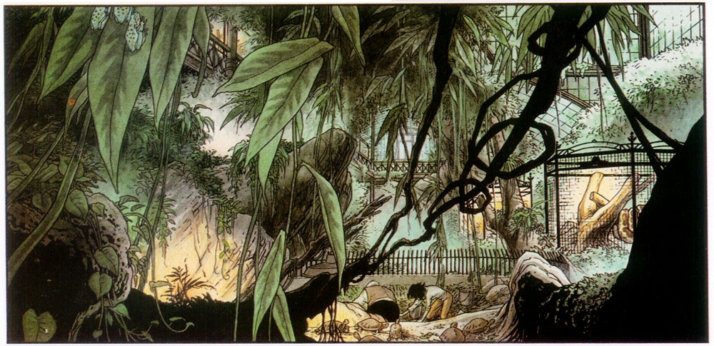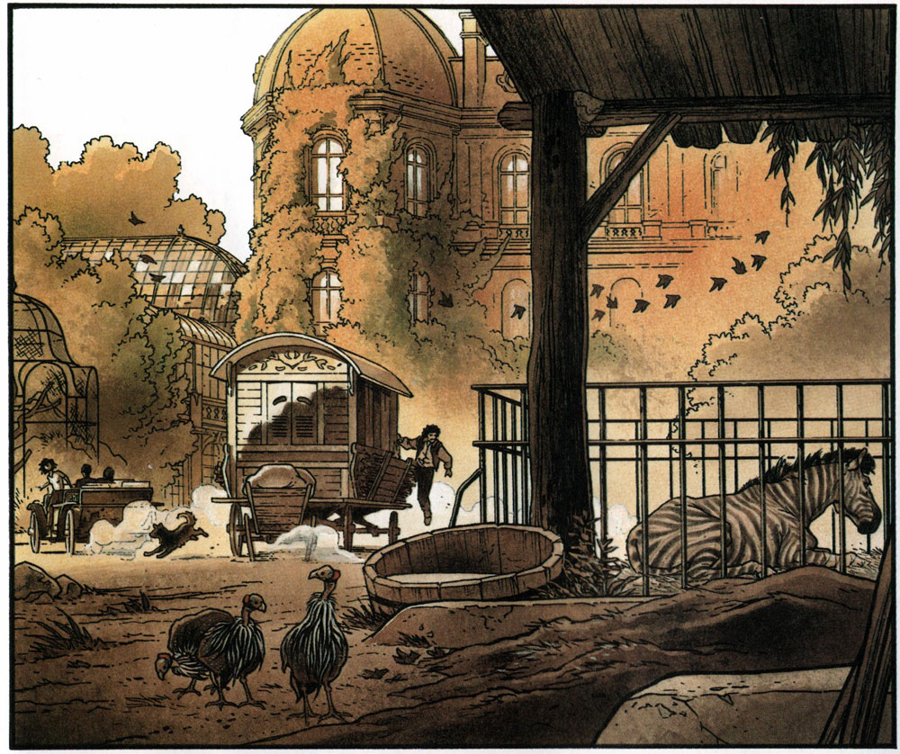 Like the settings in the 'Broussaille' stories, the zoo can be considered a character in itself. It loses most of its grandeur over the course of the narrative, as the wartime tragedies take over the carefree environment. The first two installments were published in Dupuis' literary Aire Libre collection in 1994 and 1999. The third and final volume of 2007 followed Anna on her journey through war-torn towns in search of Célestin, who had volunteered as a medic at the front. With its monumental drawings, well-considered use of color and touching spiritual character growth, 'Zoo' too is seen as a masterpiece of European comics.