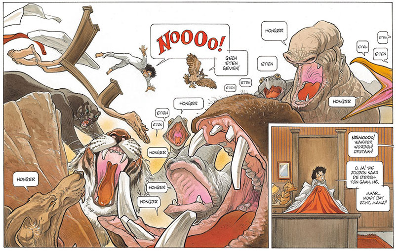 A commission project that worked out extraordinarily was Frank Pé's version of Winsor McCay's 'Little Nemo in Slumberland'. A Parisian gallery owner asked Pé to create a couple of pages in homage to this classic American newspaper comic. The artist felt so at home in McCay's magical dreamworlds, that he created enough material for two luxury books, published by Toth in 2014 and 2016. Pé wasn't the first European to try his hand at 'Little Nemo'. 'Hé, Nic! Tu Rêves?' (1980-1982) was Hermann's humorous wink at the original series in Spirou, and Moebius and Bruno Marchand created their own graphic novel interpretation of 'Little Nemo' (1994-2002) at Casterman. Pé's version captures the spirit of McCay's original the best, albeit in a contemporary setting. The artist excelled in painting many realistic animals with human character traits, and each episode ended traditionally with Nemo waking up. In 2020, Dupuis collected all the stories in one big volume, making Frank's enchanting work accessible to a wider audience.
