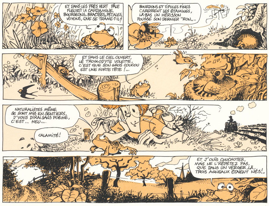 Spirou issue #2108 of 7 September 1978 first introduced Frank's signature character, the red-headed, bespectacled student 'Broussaille' (known as 'Ragebol' in the magazine's Dutch-language edition, Robbedoes). He became the mascot of the magazine's nature section, which was originally the realm of illustrator René Hausman. But instead of Hausman's poetic renderings of nature's beauty, Pé chose a more philosophical approach. The 'Papiers de Broussaille' ("Broussaille's letters") were romantic ponderings of a sentimental nature lover during his countryside walks. They were informative, full of atmosphere and not limited to wild animals alone. Some episodes were dedicated to city animals or pets, and offered practical tips for arranging and maintaining a terrarium, for instance.