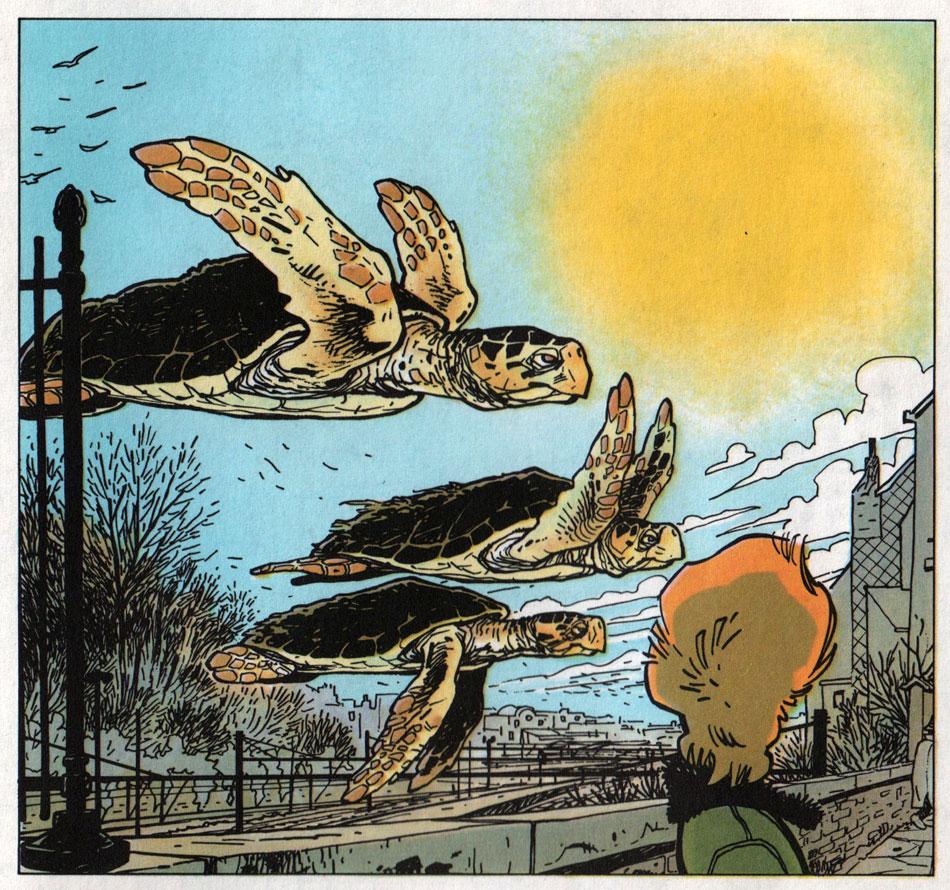 In the longer 'Broussaille' stories, Frank not only showcased his talent for drawing animals, but also his ability to make cities and landscapes an integral part of the storytelling. Brussels' Leopold Quarter forms the setting of Frank and Bom's first volume, 'Les Baleines Publiques' ("The Public Whales", 1984). The reader joins Broussaille in a dreamlike fantasy trip through the city, where whales, fish and other sea creatures swim through the streets. The mystery is enhanced when Broussaille finds a 1929 print with the exact visualization of his imagination. His investigation leads to a cave underneath the Museum of Natural Sciences, where the astonished hero stands eye to eye with a real-life whale. In a 1992 interview with the fanzine Rêve-en-Bulles, Frank explained that this "dream come true" motive was symbolic for the hero's transition into adulthood, when the inner world of a child is replaced by the outer world of self-awareness and practical issues of an adult. Today, 'Les Baleines Publiques' stands as a contemporary classic of Franco-Belgian comics, praised for its poetry and romance, without becoming mushy or heavy-handed.