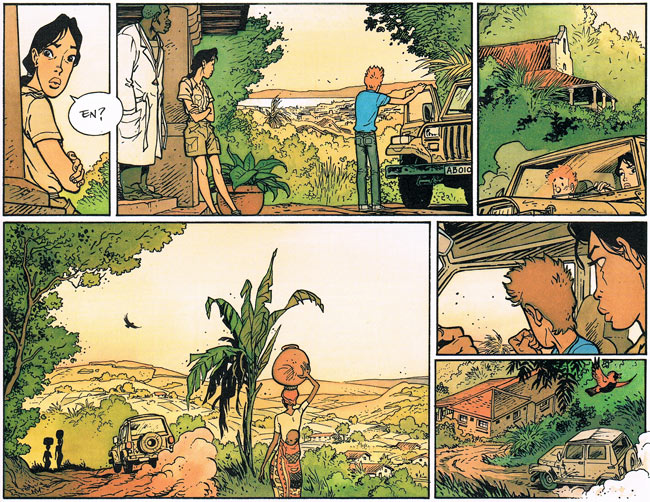 Self-development remained a prominent theme in the 'Broussaille' series. Over the course of the stories, Frank's artwork also evolved from semi-caricatural into a more mature realism. In 'Les Sculpteurs de Lumière' ("The Sculptors of Light", 1986), Broussaille visits his uncle René (who shares his looks with illustrator René Hausman) in the Belgian countryside, where the construction of a new factory rouses the emotions, while the secrets of an ancient fraternity trigger mysterious events. 'La Nuit du Chat' ("The Night of the Cat", 1989) starts off as a nocturnal search for Broussaille's cat, but turns into the young hero finding his true love, Catherine. After this original coming-of-age trilogy, Broussaille's appearances in Spirou became more sporadic. The semi-long episodes 'Au Japon' (1994), a solo effort by Frank, and 'Sandrine des Collines' (2000) gave the artist an opportunity to present his graphic renderings of Japan and Burundi. Both stories were collected in the book 'Sous deux Soleils' ("Under two Suns", 2000). Frank Pé was solely responsible for the series' swan song so far, a spiritual journey through nature under the title 'Un faune sur l'Épaule' ("A Faun on the Shoulder", 2003).