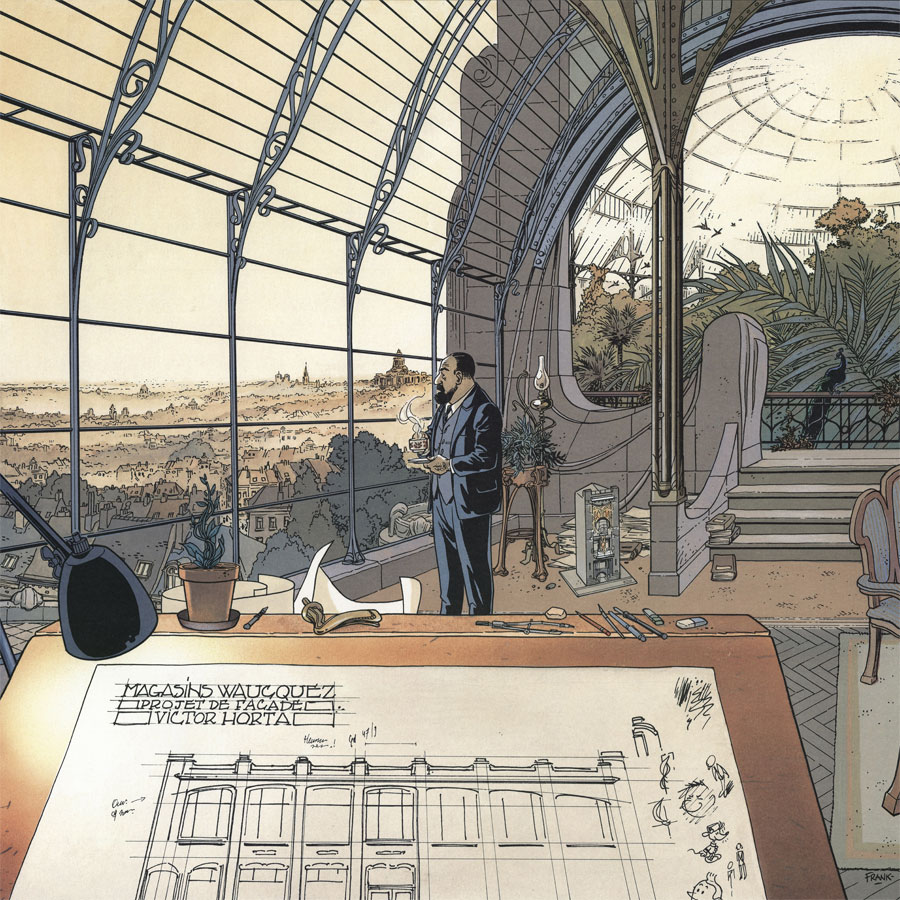 Drawing by Frank Pé in homage to Belgian architect Victor Horta. The building depicted in the drawing is the Magasins Waucquez in the Rue the Sable / Zandstraat in Brussels, nowadays better known as the Belgian Comics Center. In the margins of his paper we see little sketches of André Franquin's 'Gaston Lagaffe', Raymond Macherot's 'Chlorophylle' and Hergé's 'Tintin'.