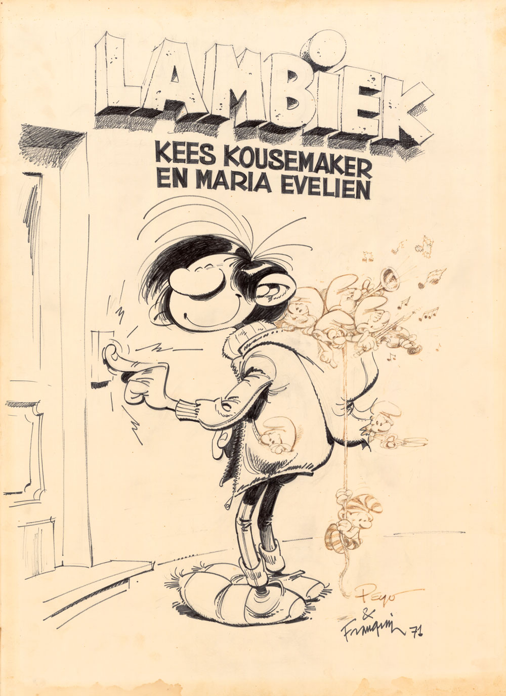 Franquin and Peyo made this drawing for Lambiek's Kees Kousemaker in 1971. Since then, the artwork of the Smurfs has nearly faded out...