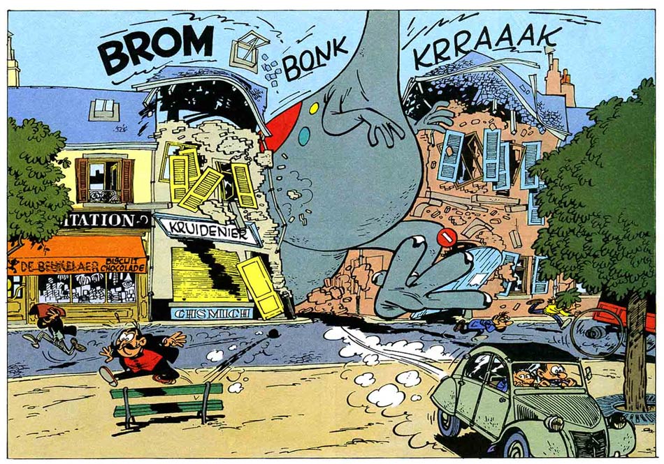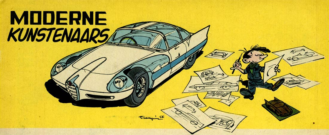 By many considered the top of European humor comics, Franquin counts to this day as the key representative of the "School of Marcinelle", the round and energetic drawing style that reflects the joy and playfulness of Spirou magazine. Other important followers were Peyo, Maurice Tillieux, Will and Jean Roba, but Franquin set the standard. It has left a lasting mark on European comics, just like its counterpart, Hergé's strict Clear Line-driven "School of Brussels". From his early years with clean "Atomic style" designs to the virtuoso bounciness of his later brush work, Franquin's artwork still looks as fresh as ever. His ability to capture energy and life in his drawings is unsurpassed. His human and animal characters are so vital, they almost hop off the pages. His vehicles and other objects are equally dashing, although they maintain a technical accuracy. Before drawing a page, Franquin made preliminary sketches of the required objects, animals or characters. Sometimes, he used photographs as inspiration, sometimes he drew them from the top of his head. By exercising and studying, he found a way to give every element a proper caricatural and distinguished look. As a result, when Franquin drew a fuse box, it was accurate and cartoony at the same time. Another prime example was Gaston's cat, whose bushy hair, whiskers and hyperactive behavior revealed Franquin's thorough study of cats. He was able to get the "feel" of the real-life animal.