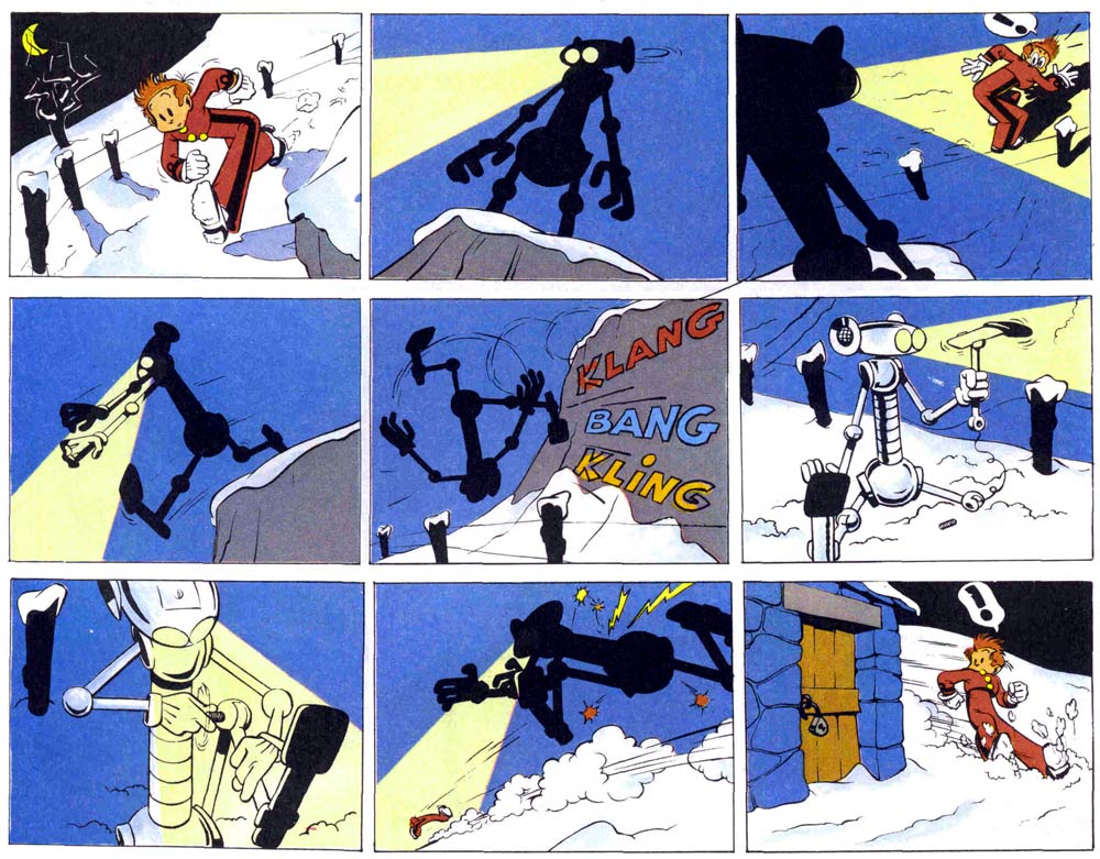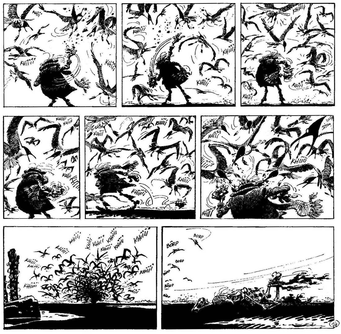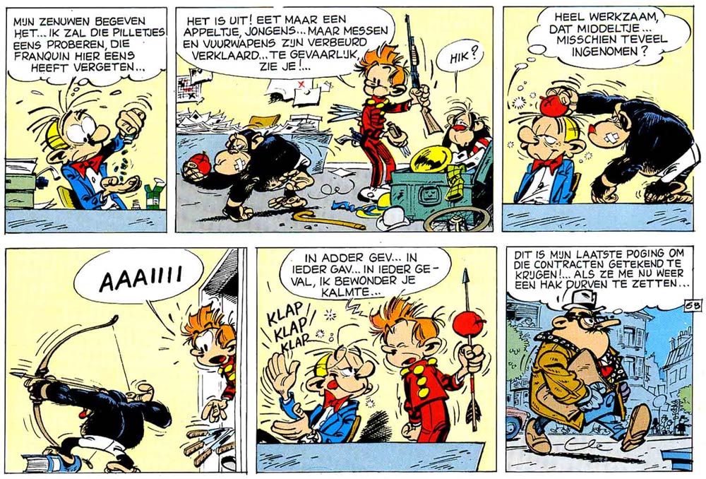 An example of Franquin's storytelling and timing, in 'Bravo! Les Brothers' (1965). Franquin leaves out the shot where the arrow actually hits the apple.