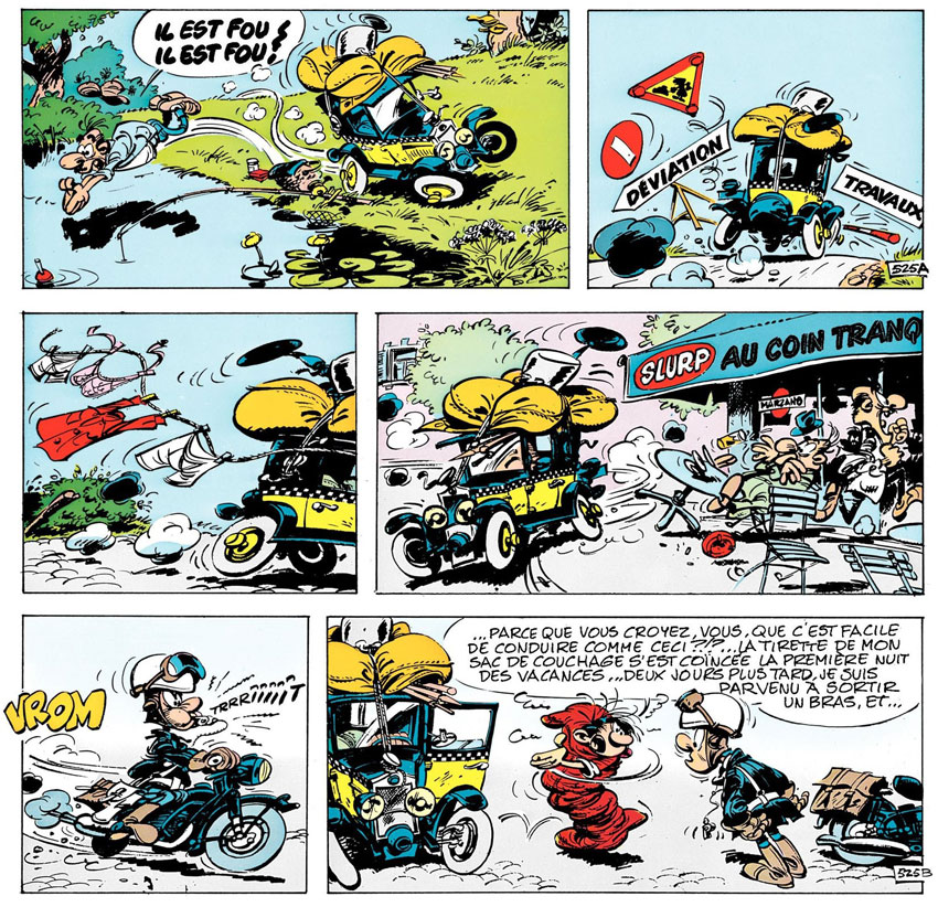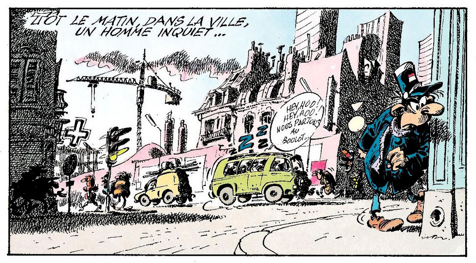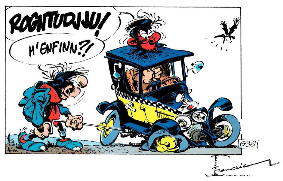 Out of the office, Gaston also has difficulties dealing with authority. When he drives around his rickety Fiat 509 car, the local police officer Longtarin is on the watch to fine Gaston for parking his car in the wrong spot or polluting the air. In the late 1970s episodes, Gaston and Longtarin's feud resulted in a full-blown "parking meter war", in which Gaston constantly tries to sabotage the local parking meters before Longtarin can fine him. It was a result of Franquin's own hatred of the devices, which he felt took too much space on the narrow streets and were a shameless way of extracting money from people. Spirou magazine supported the action by issuing special stickers which people could stick to the meters saying "You have paid to drive, now pay to stop..."