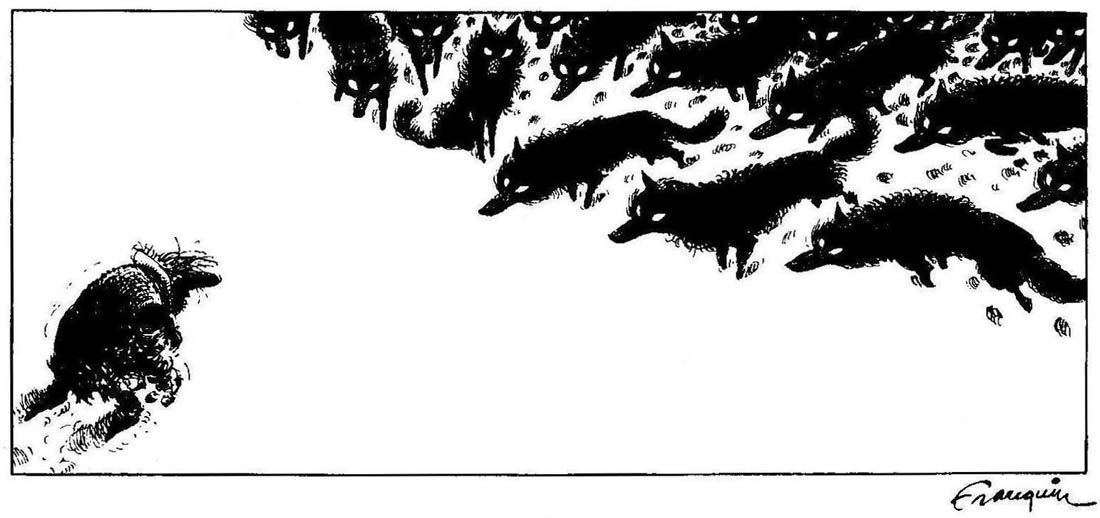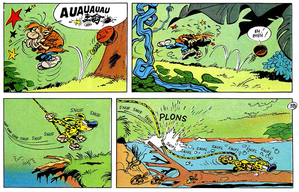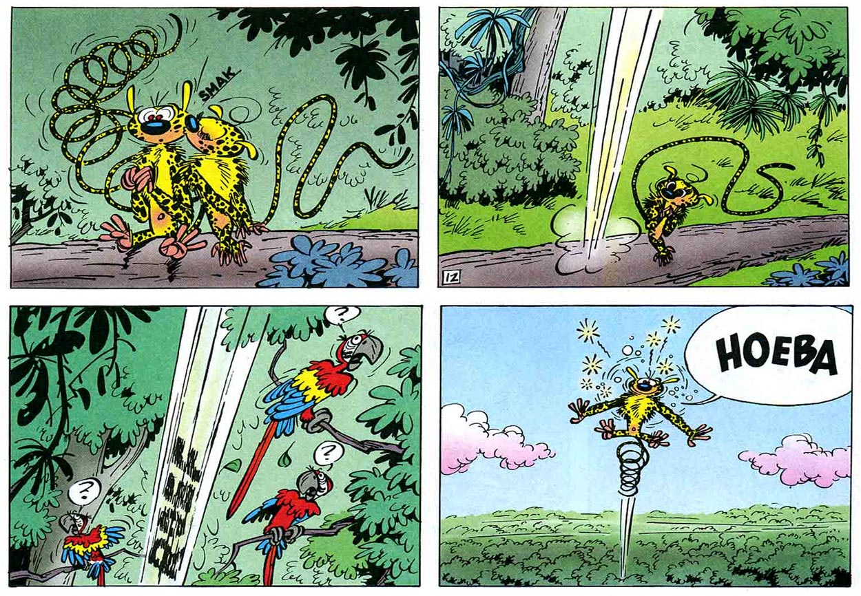Just as appealing as his human characters were Franquin's animals. Spirou already had a pet squirrel, Spip, introduced in the early 1940s by Rob-Vel. Franquin gave Spip more personality, but besides having Spip give cynical commentary and bite the occasional villain, Franquin felt limited by the rodent's possibilities. Franquin had much more fun with larger and more grotesque animals, like the revived good-natured dinosaur in 'Le Voyageur du Mésozoïque' ("The Traveller from the Mesozoic", 1957), the gorillas in 'Le Gorille a Bonne Mine' ("The Gorilla Looks Good", 1956) and the mischievous circus monkeys from 'Bravo les Brothers!' (1965). However, Franquin's most iconic animal was completely fictional. The leopard-spotted monkey-like Marsupilami with its extremely long tail, short-tempered nature and familiar "Houba! Houba!" call first appeared in 'Spirou et les Héritiers' (1951), when Spirou and Fantasio captured it in the Palombian jungle. Graphically inspired by E.C. Segar's Eugene the Jeep from the 'Thimble Theater' strip, the Marsupilami offered Franquin endless opportunities for gags and storylines. In the next story, 'Les Voleurs du Marsupilami' ("The Robbers of the Marsupilami", 1952), the rare animal was abducted from the zoo. After Spirou and Fantasio rescued the Marsupilami from the traveling circus of the evil Zabaglione (all the villains in Franquin's stories seem to have names starting with a Z), they adopted him as their pet. The Marsupilami appeared in all further adventures from the Franquin era. Subsequent episodes introduced new remarkable qualities of the animal, such as an amphibian ability to swim underwater and a parrot-like capability of reproducing sounds and speech. The standout episode was the non-adventure 'Le Nid des Marsupilamis' ("The Marsupilamis' Nest", 1957), which mostly consisted of a lecture by Seccotine about the Marsupilamis in their natural habitat, the Palombian jungle. Even though the two title characters had a passive role throughout the entire story, the episode is one of the most poetic in Franquin's oeuvre for its loving portrayal of Marsupilami family life. Of all his additions to the 'Spirou' universe, the Marsupilami remained Franquin's most treasured creation.