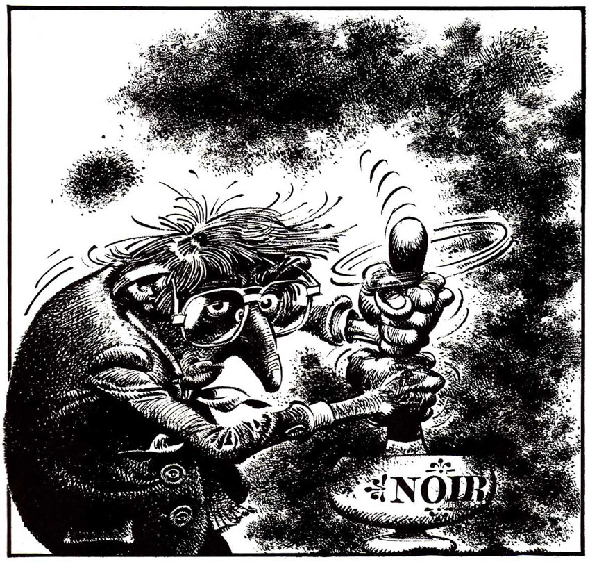 'Idées Noires' showed a side most audiences had never seen from this beloved children's comics author: cynical and outspoken political. It polarized readers, but still grew into a cult classic. Fans admire it as Franquin's most adult and personal work. Although some gags are dated, most are remarkably - and depressingly - timeless. Despite the nihilism, the artwork is fabulous, ranking among Franquin's finest achievements. The punchlines are either witty or so disturbing that they keep haunting the reader long after they've put the book aside. Although 'Idées Noires' temporarily gave Franquin some creative and emotional solace, he eventually quit the series. The concept became too formulaic and, unsurprisingly, too depressing. Compilation books were released by Éditions Audie in 1981 and 1984, and only a handful of new gags appeared in 1982 and 1983. After that, Franquin refrained from drawing comics for several years.