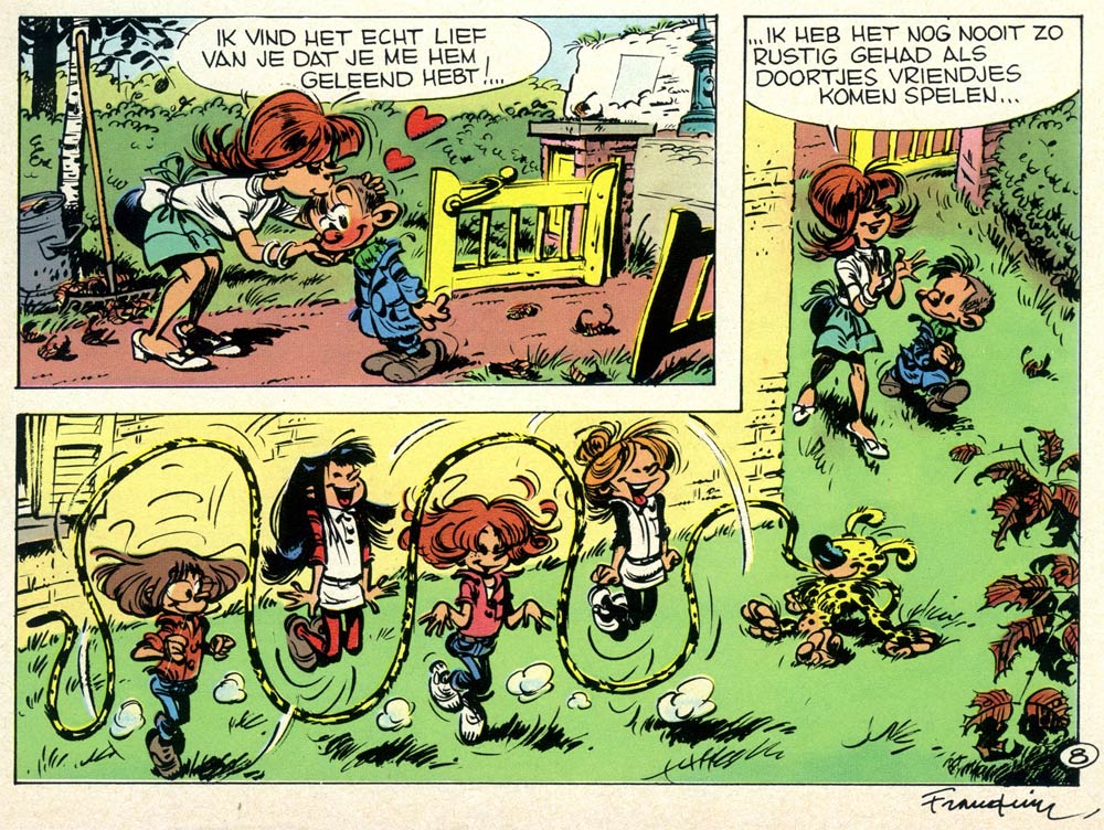 Franquin's pages were refined into the tiniest details, paying as much attention to the main action as to funny background jokes, furniture design and works of art hanging on the walls. Still, all these additional details never distracted the reader from the story flow. With his keen sense of timing and balance, Franquin kept his comic readable, even when using black-and-white silhouettes. Famous subtle jokes by Franquin are his signatures at the bottom of his gag pages. From 1972 on, he began fooling around with them as a running gag. Every signature in the later 'Gaston' and 'Idées Noires' pages summarized the topic of the gag. If a gag, for instance, involved an explosion, the Franquin signature exploded. If the punchline included a bulldozer, Franquin's name was swept away by one. He found so many creative ways to turn his signature into a doodle, that the gimmick became a trademark and even got a life of its own. In 1992, Dupuis released a selection of his signature jokes under the title 'Signé Franquin'.