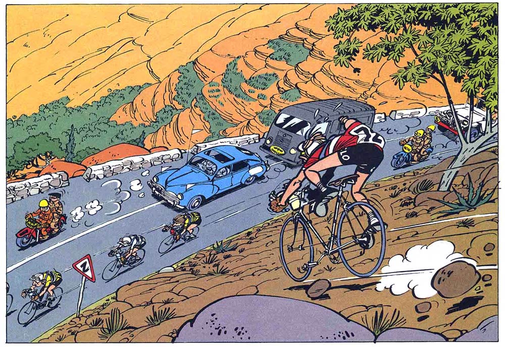 The enlargement of the Spirou universe and his humorous and well-structured stories made Franquin, in the minds of many, the ultimate 'Spirou et Fantasio' artist. Since his stories mark the 1950s launch of the ongoing 'Spirou et Fantasio' album collection, his impact has overshadowed that of his two predecessors, Rob-Vel and Jijé. Every subsequent 'Spirou' artist was always compared to Franquin. His stories show unsurpassed talent for exciting storytelling, comic timing and appealing characters. In a time when most Franco-Belgian comic book protagonists were one-dimensional heroes acting in good-versus-evil plots, Franquin's characters reflected the artist's world view and morals. The friendship between the easy-going Spirou and the impulsive Fantasio formed an important aspect of the plots, most notably in the episode 'La Mauvaise Tête' ("The False Head", 1954), when Spirou has to clear his friend from a larceny frame-up. Instead of being pure evil, the villains in Franquin's stories show redeeming qualities. Several 'Spirou' stories were inspired by the artist's personal interests and character traits. Franquin's strong anti-militaristic sentiments are obvious in episodes like 'Le Dictateur et le Champignon' (1953-1954) and 'QRN sur Bretzelburg' (1961-1963). His love for animals is expressed in the Marsupilami-centered episodes, but also in 'Le Gorille à Bonne Mine' (1956), 'Le Voyageur du Mésozoïque' (1957) and 'Bravo les Brothers!' (1965). Sports play an important role in 'Spirou sur le Ring' (boxing, 1948), 'Les Voleurs du Marsupilami' (soccer, 1952) and 'La Mauvaise Tête' (cycling, 1954), while cars form the major plot elements in 'La Corne de Rhinocéros' (1953) and 'La Quick Super' (1955). His drawing style was also groundbreaking, gradually shifting from a clean stylization to flowing vivid linework. Although Franquin's comics were cartoonish, he was extremely accurate in technical depictions of objects and machinery. Even his fictional technology remains believable, like the robot in 'Radar le Robot', the single-person submarine in 'Le Repaire de la Murène' ("The Moray's Lair", 1954-1955) and the high-tech weaponry from the Zorglub cycle. The two fictional and slickly designed blue Turbot convertibles that the heroes use during their adventures have become so iconic that lifesize reproductions have been made by fans.