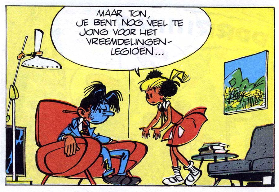 Another important brainstormer with André Franquin was Yvan Delporte, his editor-in-chief until 1968 who played an instrumental role in the development of 'Gaston Lagaffe'. After Delporte's discharge, he and Franquin continued to collaborate throughout the 1970s and 1980s. Between 1975 and 1985, their wide imagination came to blossom once again in their scripts for the magical 'Isabelle' series, drawn for Spirou magazine by Will. Isabelle is a young red-headed girl from a small French coastal town, and constantly confronted with the magic surrounding her. Her aunt Ursule however is completely oblivious to all the supernatural happenings, and is predominantly occupied with baking cakes and making sure her niece is dressed warmly enough. From 1969 on, the series' poetic first episodes were written by Delporte in collaboration with Raymond Macherot. A true plunge into fantasy came in 1975, when Franquin joined the writers' team. 'Les Maléfices de l'Oncle Hermès' (1975) marked the introduction of Isabelle's great-great-uncle of the seventh generation Hermès, a magician with goat legs. He becomes a regular cast member after Isabelle frees him from a magical lamp, where he was put by the evil witch Kalendula. He then marries the beautiful Calendula - a descendant of the evil witch - and the pair become the instigators of many future adventures. Macherot left the team after 'L'Astragale de Cassiopée' (1976), and Franquin after 'L'Envoûtement' (1985), leaving Will and Delporte to make the remaining albums as a duo until the series' end in 1994. Another comic series written by Franquin and Delporte was 'Les Démêles d'Arnest Ringard et Augraphie', a humorous series of short stories about the ongoing battle between a man and a mole. Drawn by Frédéric Jannin, the first set of stories ran in 1978-1980; the feature was briefly revived between 1993 and 1995. This series also appeared in Dutch under the title 'Geharrewar tussen Pieter Pook en Molleke'.